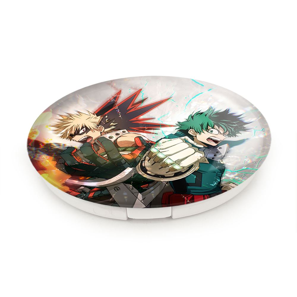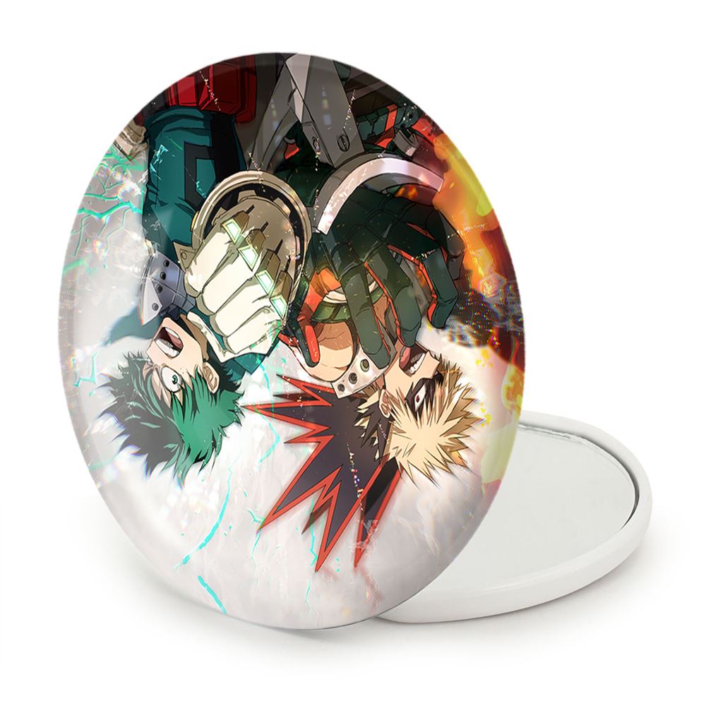 آینه های تاشو میدوریا و باکوگو انیمه آکادمی قهرمان من خندالو، از جنس پلاستیک فشرده ABS تولید شده و به رنگ سفید می باشد. یکی از آینه ها ابعاد واقعی را نشان داده و دیگری با قابلیت بزرگنمایی، جزئیات را بهتر نمایش می دهد. ابعاد هر یک از آینه ها، دایره ای به قطر 7.5 سانت می باشد که نه خیلی بزرگ و غیر قابل استفاده در کیف آرایشی ست و نه خیلی کوچک که تصویر خاصی در آن مشاهده نشود. آینه تاشو میدوریا و باکوگو انیمه آکادمی قهرمان من سایزی استاندارد و کارآمد دارد و در هر کیفی جا میگیرد. چاپ طرح بوسیله چاپگرهای دیجیتال شش رنگ با شفافیت و کیفیتی مثال زدنی بر روی یک وجه از بدنه ی آینه انجام گرفته و با روکش لمینت حرارتی پوشیده شده که در مقابل آسیب و خط و خش مقاوم بوده و کیفیت بالایی دارد. درب آینه بوسیله قفل بدنه ی آن، باز نمی ماند و کاملا بسته می شود و مناسب قرار گیری در کیف لوازم آرایش و کیف های کوچک دستی نیز هست. آینه های تاشو میدوریا و باکوگو انیمه آکادمی قهرمان من خندالو با تنوع طرحی بسیار بالا، سلیقه هر نوع مخاطبی را تامین میکند.