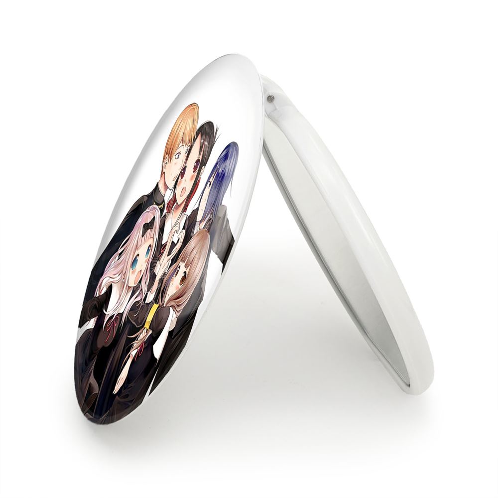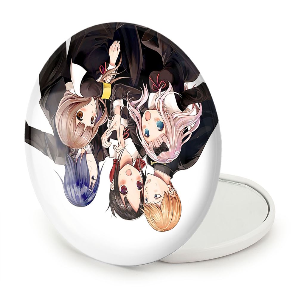 آینه های تاشو میوکی و کاگویا و چیکا انیمه کاگویا ساما خندالو، از جنس پلاستیک فشرده ABS تولید شده و به رنگ سفید می باشد. یکی از آینه ها ابعاد واقعی را نشان داده و دیگری با قابلیت بزرگنمایی، جزئیات را بهتر نمایش می دهد. ابعاد هر یک از آینه ها، دایره ای به قطر 7.5 سانت می باشد که نه خیلی بزرگ و غیر قابل استفاده در کیف آرایشی ست و نه خیلی کوچک که تصویر خاصی در آن مشاهده نشود. آینه تاشو میوکی و کاگویا و چیکا انیمه کاگویا ساما سایزی استاندارد و کارآمد دارد و در هر کیفی جا میگیرد. چاپ طرح بوسیله چاپگرهای دیجیتال شش رنگ با شفافیت و کیفیتی مثال زدنی بر روی یک وجه از بدنه ی آینه انجام گرفته و با روکش لمینت حرارتی پوشیده شده که در مقابل آسیب و خط و خش مقاوم بوده و کیفیت بالایی دارد. درب آینه بوسیله قفل بدنه ی آن، باز نمی ماند و کاملا بسته می شود و مناسب قرار گیری در کیف لوازم آرایش و کیف های کوچک دستی نیز هست. آینه های تاشو میوکی و کاگویا و چیکا انیمه کاگویا ساما خندالو با تنوع طرحی بسیار بالا، سلیقه هر نوع مخاطبی را تامین میکند.