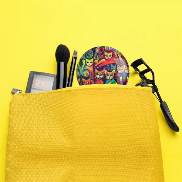 آینه های تاشو نقاشی انتزاعی خندالو، از جنس پلاستیک فشرده ABS تولید شده و به رنگ سفید می باشد. یکی از آینه ها ابعاد واقعی را نشان داده و دیگری با قابلیت بزرگنمایی، جزئیات را بهتر نمایش می دهد. ابعاد هر یک از آینه ها، دایره ای به قطر 7.5 سانت می باشد که نه خیلی بزرگ و غیر قابل استفاده در کیف آرایشی ست و نه خیلی کوچک که تصویر خاصی در آن مشاهده نشود. آینه تاشو نقاشی انتزاعی سایزی استاندارد و کارآمد دارد و در هر کیفی جا میگیرد. چاپ طرح بوسیله چاپگرهای دیجیتال شش رنگ با شفافیت و کیفیتی مثال زدنی بر روی یک وجه از بدنه ی آینه انجام گرفته و با روکش لمینت حرارتی پوشیده شده که در مقابل آسیب و خط و خش مقاوم بوده و کیفیت بالایی دارد. درب آینه بوسیله قفل بدنه ی آن، باز نمی ماند و کاملا بسته می شود و مناسب قرار گیری در کیف لوازم آرایش و کیف های کوچک دستی نیز هست. آینه های تاشو نقاشی انتزاعی خندالو با تنوع طرحی بسیار بالا، سلیقه هر نوع مخاطبی را تامین میکند.