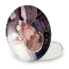 آینه های تاشو هان گروه استری کیدز Stary Kids خندالو، از جنس پلاستیک فشرده ABS تولید شده و به رنگ سفید می باشد. یکی از آینه ها ابعاد واقعی را نشان داده و دیگری با قابلیت بزرگنمایی، جزئیات را بهتر نمایش می دهد. ابعاد هر یک از آینه ها، دایره ای به قطر 7.5 سانت می باشد که نه خیلی بزرگ و غیر قابل استفاده در کیف آرایشی ست و نه خیلی کوچک که تصویر خاصی در آن مشاهده نشود. آینه تاشو هان گروه استری کیدز Stary Kids سایزی استاندارد و کارآمد دارد و در هر کیفی جا میگیرد. چاپ طرح بوسیله چاپگرهای دیجیتال شش رنگ با شفافیت و کیفیتی مثال زدنی بر روی یک وجه از بدنه ی آینه انجام گرفته و با روکش لمینت حرارتی پوشیده شده که در مقابل آسیب و خط و خش مقاوم بوده و کیفیت بالایی دارد. درب آینه بوسیله قفل بدنه ی آن، باز نمی ماند و کاملا بسته می شود و مناسب قرار گیری در کیف لوازم آرایش و کیف های کوچک دستی نیز هست. آینه های تاشو هان گروه استری کیدز Stary Kids خندالو با تنوع طرحی بسیار بالا، سلیقه هر نوع مخاطبی را تامین میکند.