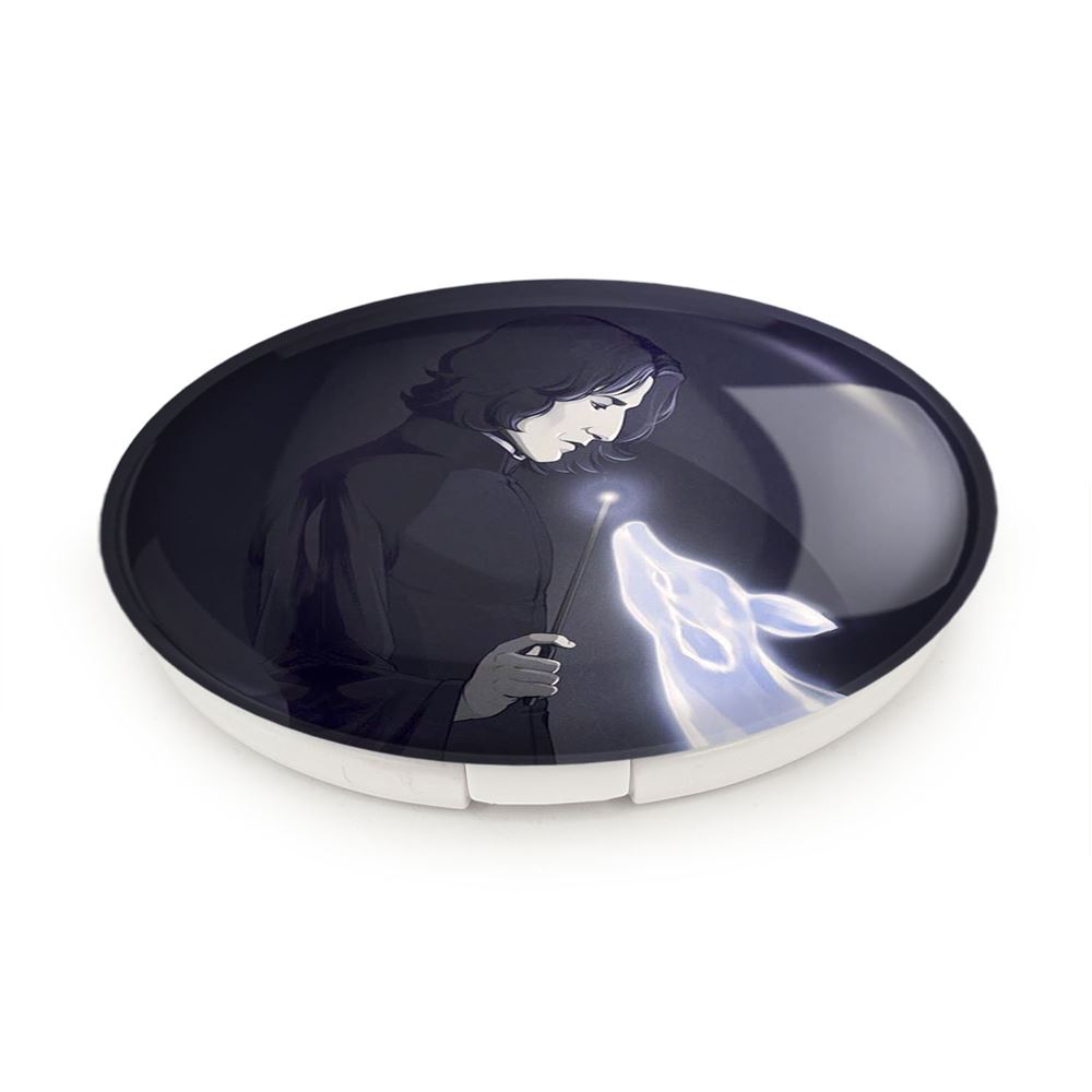 آینه های تاشو هری پاتر اسنیپ خندالو، از جنس پلاستیک فشرده ABS تولید شده و به رنگ سفید می باشد. یکی از آینه ها ابعاد واقعی را نشان داده و دیگری با قابلیت بزرگنمایی، جزئیات را بهتر نمایش می دهد. ابعاد هر یک از آینه ها، دایره ای به قطر 7.5 سانت می باشد که نه خیلی بزرگ و غیر قابل استفاده در کیف آرایشی ست و نه خیلی کوچک که تصویر خاصی در آن مشاهده نشود. آینه تاشو هری پاتر اسنیپ سایزی استاندارد و کارآمد دارد و در هر کیفی جا میگیرد. چاپ طرح بوسیله چاپگرهای دیجیتال شش رنگ با شفافیت و کیفیتی مثال زدنی بر روی یک وجه از بدنه ی آینه انجام گرفته و با روکش لمینت حرارتی پوشیده شده که در مقابل آسیب و خط و خش مقاوم بوده و کیفیت بالایی دارد. درب آینه بوسیله قفل بدنه ی آن، باز نمی ماند و کاملا بسته می شود و مناسب قرار گیری در کیف لوازم آرایش و کیف های کوچک دستی نیز هست. آینه های تاشو هری پاتر اسنیپ خندالو با تنوع طرحی بسیار بالا، سلیقه هر نوع مخاطبی را تامین میکند.