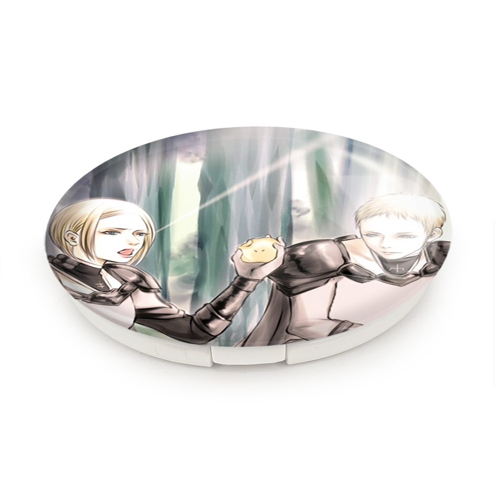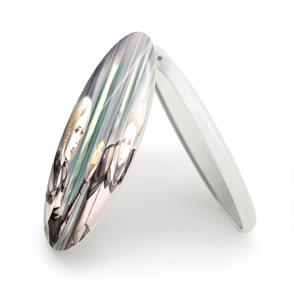 آینه های تاشو هلن و دنوه انیمه کلیمور خندالو، از جنس پلاستیک فشرده ABS تولید شده و به رنگ سفید می باشد. یکی از آینه ها ابعاد واقعی را نشان داده و دیگری با قابلیت بزرگنمایی، جزئیات را بهتر نمایش می دهد. ابعاد هر یک از آینه ها، دایره ای به قطر 7.5 سانت می باشد که نه خیلی بزرگ و غیر قابل استفاده در کیف آرایشی ست و نه خیلی کوچک که تصویر خاصی در آن مشاهده نشود. آینه تاشو هلن و دنوه انیمه کلیمور سایزی استاندارد و کارآمد دارد و در هر کیفی جا میگیرد. چاپ طرح بوسیله چاپگرهای دیجیتال شش رنگ با شفافیت و کیفیتی مثال زدنی بر روی یک وجه از بدنه ی آینه انجام گرفته و با روکش لمینت حرارتی پوشیده شده که در مقابل آسیب و خط و خش مقاوم بوده و کیفیت بالایی دارد. درب آینه بوسیله قفل بدنه ی آن، باز نمی ماند و کاملا بسته می شود و مناسب قرار گیری در کیف لوازم آرایش و کیف های کوچک دستی نیز هست. آینه های تاشو هلن و دنوه انیمه کلیمور خندالو با تنوع طرحی بسیار بالا، سلیقه هر نوع مخاطبی را تامین میکند.