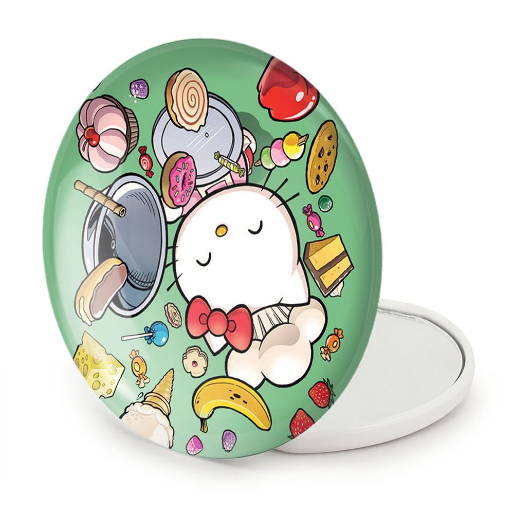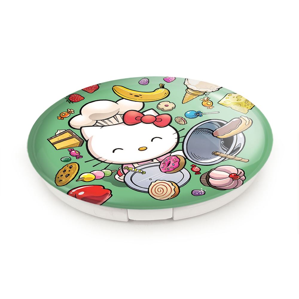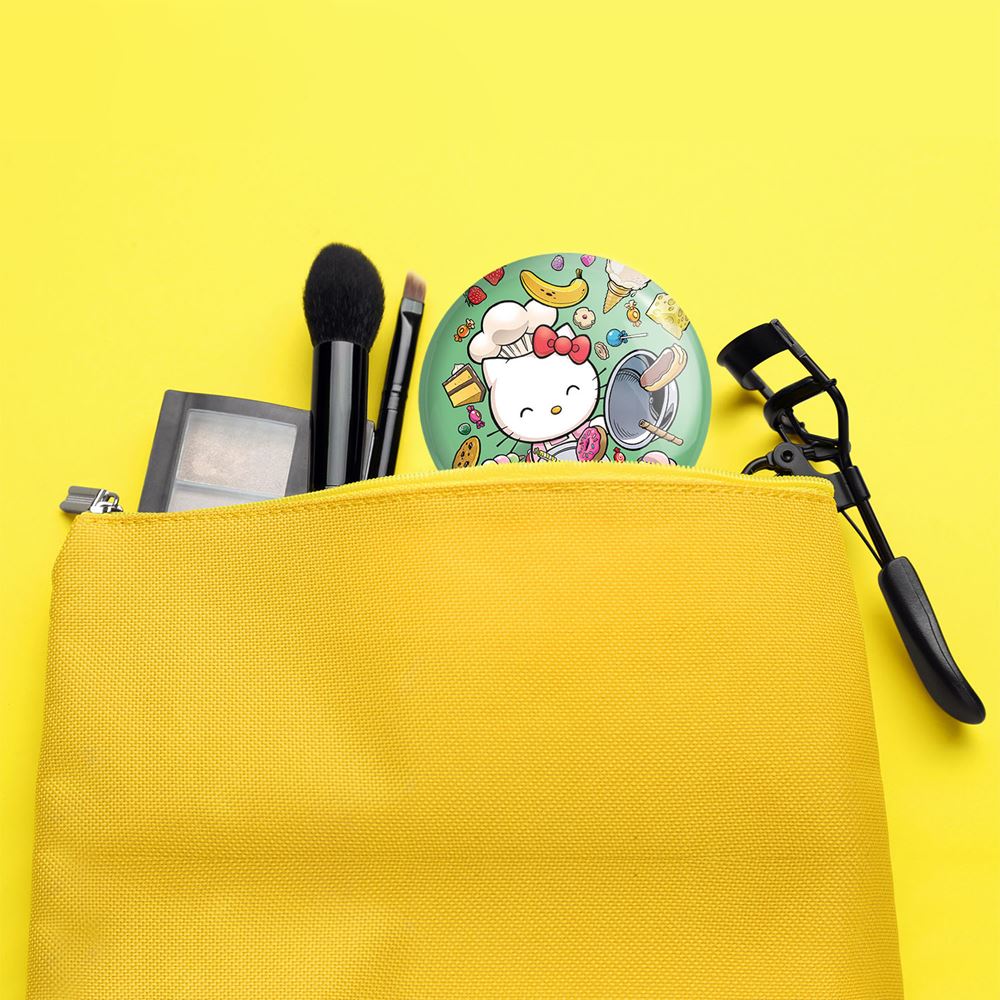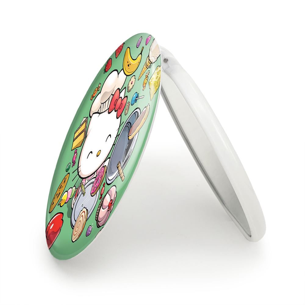 آینه های تاشو هلو کیتی خندالو، از جنس پلاستیک فشرده ABS تولید شده و به رنگ سفید می باشد. یکی از آینه ها ابعاد واقعی را نشان داده و دیگری با قابلیت بزرگنمایی، جزئیات را بهتر نمایش می دهد. ابعاد هر یک از آینه ها، دایره ای به قطر 7.5 سانت می باشد که نه خیلی بزرگ و غیر قابل استفاده در کیف آرایشی ست و نه خیلی کوچک که تصویر خاصی در آن مشاهده نشود. آینه تاشو هلو کیتی سایزی استاندارد و کارآمد دارد و در هر کیفی جا میگیرد. چاپ طرح بوسیله چاپگرهای دیجیتال شش رنگ با شفافیت و کیفیتی مثال زدنی بر روی یک وجه از بدنه ی آینه انجام گرفته و با روکش لمینت حرارتی پوشیده شده که در مقابل آسیب و خط و خش مقاوم بوده و کیفیت بالایی دارد. درب آینه بوسیله قفل بدنه ی آن، باز نمی ماند و کاملا بسته می شود و مناسب قرار گیری در کیف لوازم آرایش و کیف های کوچک دستی نیز هست. آینه های تاشو هلو کیتی خندالو با تنوع طرحی بسیار بالا، سلیقه هر نوع مخاطبی را تامین میکند.