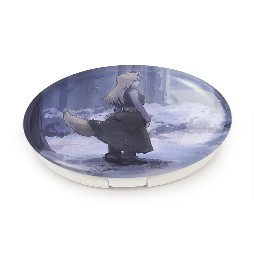 آینه های تاشو هولو انیمه ادویه و گرگ خندالو، از جنس پلاستیک فشرده ABS تولید شده و به رنگ سفید می باشد. یکی از آینه ها ابعاد واقعی را نشان داده و دیگری با قابلیت بزرگنمایی، جزئیات را بهتر نمایش می دهد. ابعاد هر یک از آینه ها، دایره ای به قطر 7.5 سانت می باشد که نه خیلی بزرگ و غیر قابل استفاده در کیف آرایشی ست و نه خیلی کوچک که تصویر خاصی در آن مشاهده نشود. آینه تاشو هولو انیمه ادویه و گرگ سایزی استاندارد و کارآمد دارد و در هر کیفی جا میگیرد. چاپ طرح بوسیله چاپگرهای دیجیتال شش رنگ با شفافیت و کیفیتی مثال زدنی بر روی یک وجه از بدنه ی آینه انجام گرفته و با روکش لمینت حرارتی پوشیده شده که در مقابل آسیب و خط و خش مقاوم بوده و کیفیت بالایی دارد. درب آینه بوسیله قفل بدنه ی آن، باز نمی ماند و کاملا بسته می شود و مناسب قرار گیری در کیف لوازم آرایش و کیف های کوچک دستی نیز هست. آینه های تاشو هولو انیمه ادویه و گرگ خندالو با تنوع طرحی بسیار بالا، سلیقه هر نوع مخاطبی را تامین میکند.