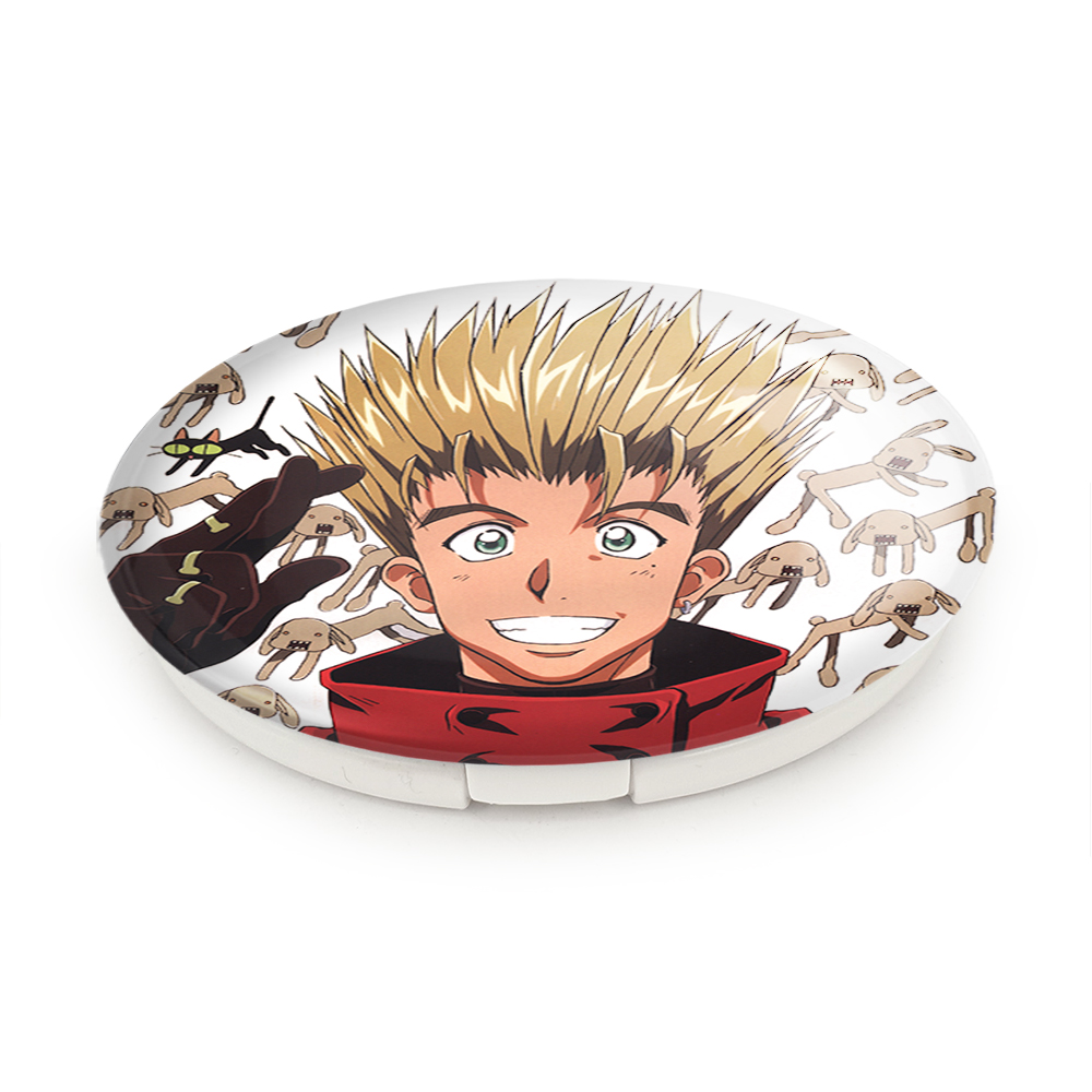 آینه های تاشو وش و کورونکو انیمه تریگان (Trigun) خندالو، از جنس پلاستیک فشرده ABS تولید شده و به رنگ سفید می باشد. یکی از آینه ها ابعاد واقعی را نشان داده و دیگری با قابلیت بزرگنمایی، جزئیات را بهتر نمایش می دهد. ابعاد هر یک از آینه ها، دایره ای به قطر 7.5 سانت می باشد که نه خیلی بزرگ و غیر قابل استفاده در کیف آرایشی ست و نه خیلی کوچک که تصویر خاصی در آن مشاهده نشود. آینه تاشو وش و کورونکو انیمه تریگان (Trigun) سایزی استاندارد و کارآمد دارد و در هر کیفی جا میگیرد. چاپ طرح بوسیله چاپگرهای دیجیتال شش رنگ با شفافیت و کیفیتی مثال زدنی بر روی یک وجه از بدنه ی آینه انجام گرفته و با روکش لمینت حرارتی پوشیده شده که در مقابل آسیب و خط و خش مقاوم بوده و کیفیت بالایی دارد. درب آینه بوسیله قفل بدنه ی آن، باز نمی ماند و کاملا بسته می شود و مناسب قرار گیری در کیف لوازم آرایش و کیف های کوچک دستی نیز هست. آینه های تاشو وش و کورونکو انیمه تریگان (Trigun) خندالو با تنوع طرحی بسیار بالا، سلیقه هر نوع مخاطبی را تامین میکند.