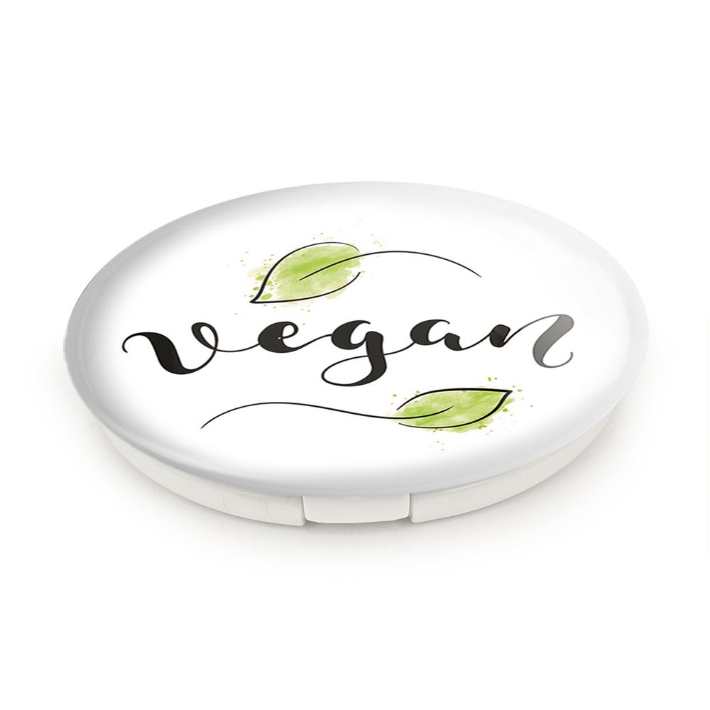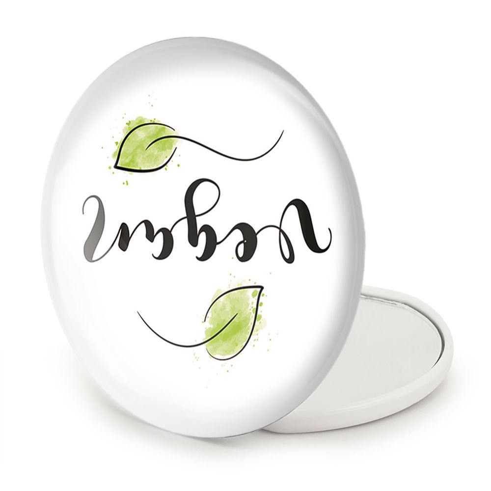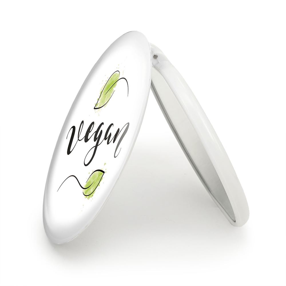 آینه های تاشو وگن Vegan خندالو، از جنس پلاستیک فشرده ABS تولید شده و به رنگ سفید می باشد. یکی از آینه ها ابعاد واقعی را نشان داده و دیگری با قابلیت بزرگنمایی، جزئیات را بهتر نمایش می دهد. ابعاد هر یک از آینه ها، دایره ای به قطر 7.5 سانت می باشد که نه خیلی بزرگ و غیر قابل استفاده در کیف آرایشی ست و نه خیلی کوچک که تصویر خاصی در آن مشاهده نشود. آینه تاشو وگن Vegan سایزی استاندارد و کارآمد دارد و در هر کیفی جا میگیرد. چاپ طرح بوسیله چاپگرهای دیجیتال شش رنگ با شفافیت و کیفیتی مثال زدنی بر روی یک وجه از بدنه ی آینه انجام گرفته و با روکش لمینت حرارتی پوشیده شده که در مقابل آسیب و خط و خش مقاوم بوده و کیفیت بالایی دارد. درب آینه بوسیله قفل بدنه ی آن، باز نمی ماند و کاملا بسته می شود و مناسب قرار گیری در کیف لوازم آرایش و کیف های کوچک دستی نیز هست. آینه های تاشو وگن Vegan خندالو با تنوع طرحی بسیار بالا، سلیقه هر نوع مخاطبی را تامین میکند.