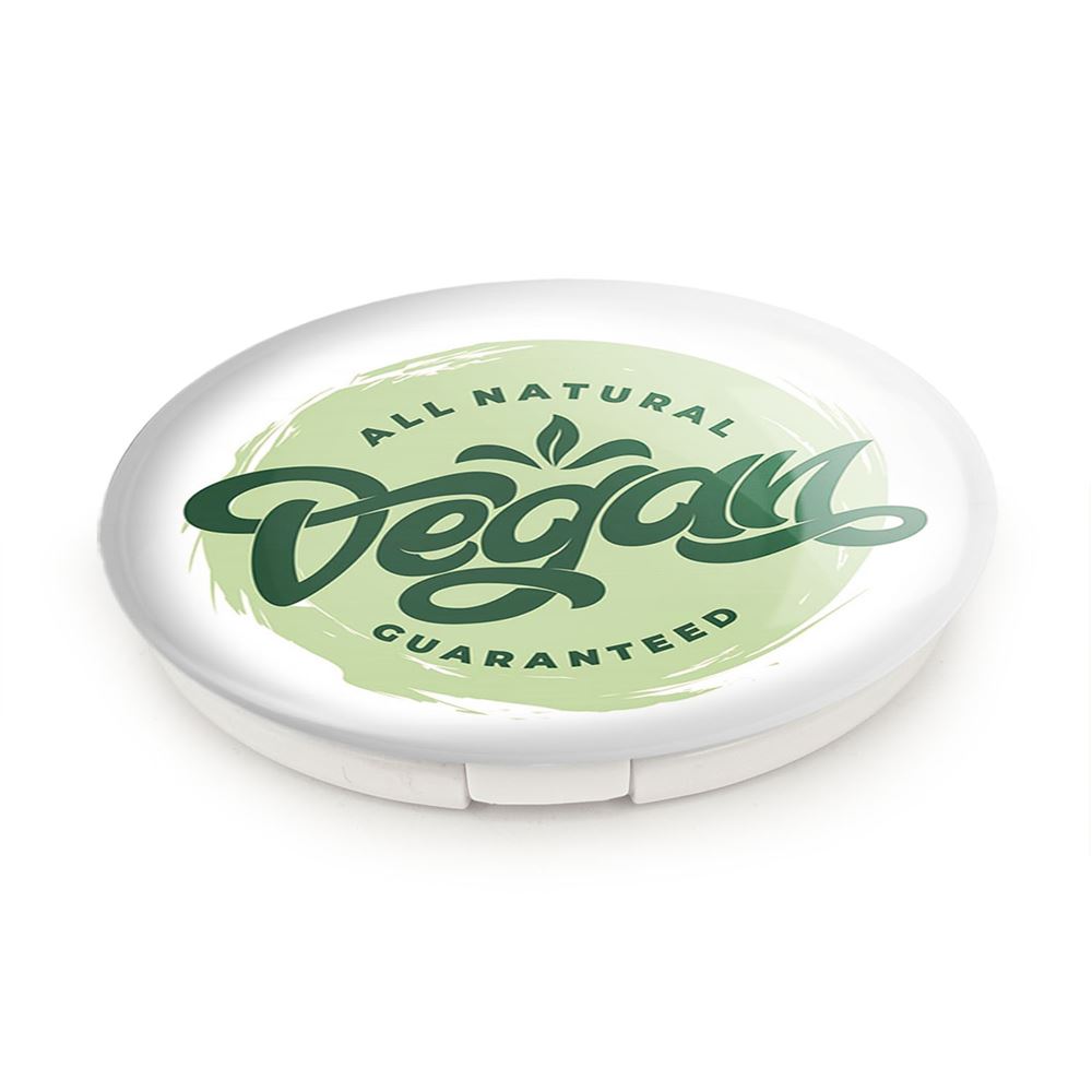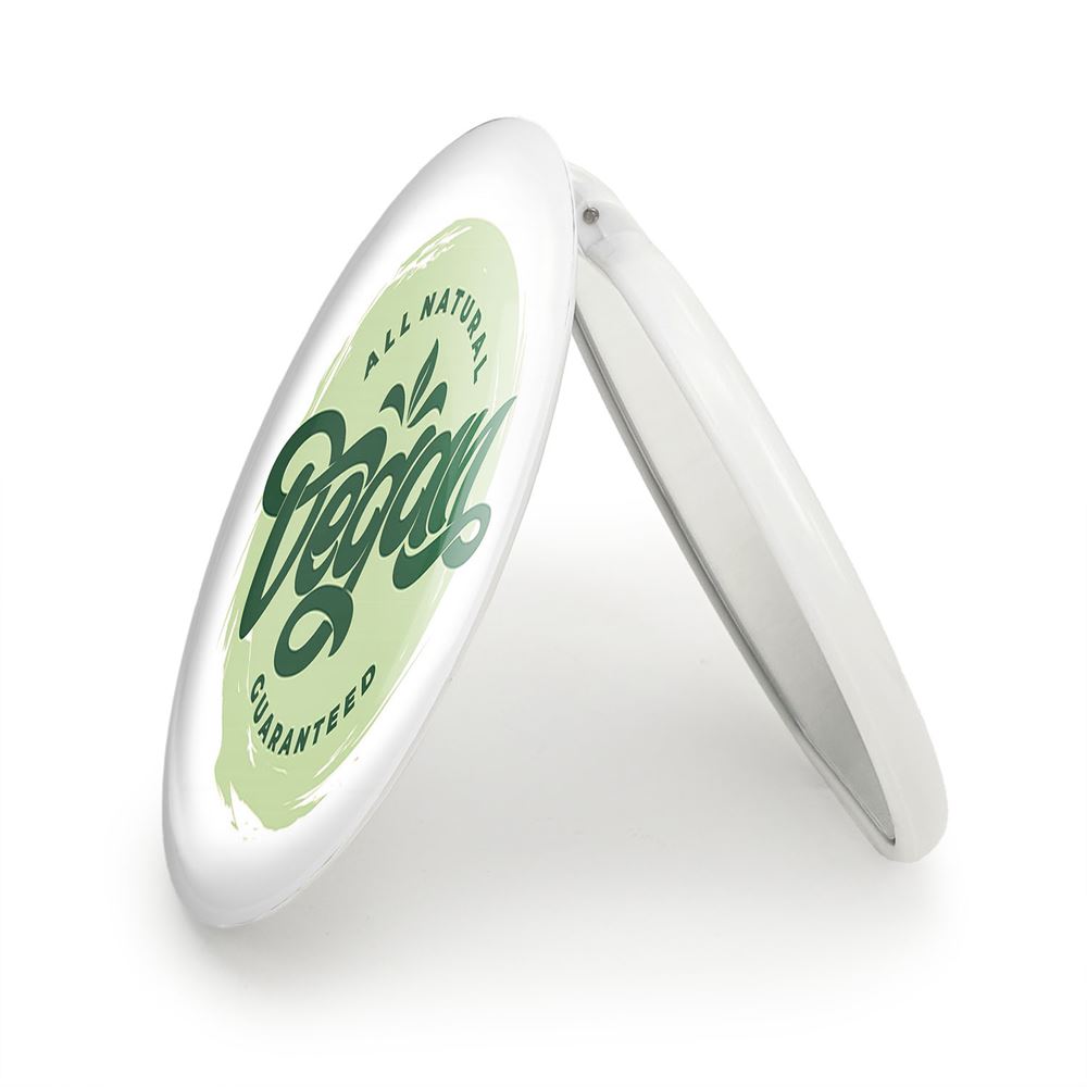 آینه های تاشو وگن Vegan خندالو، از جنس پلاستیک فشرده ABS تولید شده و به رنگ سفید می باشد. یکی از آینه ها ابعاد واقعی را نشان داده و دیگری با قابلیت بزرگنمایی، جزئیات را بهتر نمایش می دهد. ابعاد هر یک از آینه ها، دایره ای به قطر 7.5 سانت می باشد که نه خیلی بزرگ و غیر قابل استفاده در کیف آرایشی ست و نه خیلی کوچک که تصویر خاصی در آن مشاهده نشود. آینه تاشو وگن Vegan سایزی استاندارد و کارآمد دارد و در هر کیفی جا میگیرد. چاپ طرح بوسیله چاپگرهای دیجیتال شش رنگ با شفافیت و کیفیتی مثال زدنی بر روی یک وجه از بدنه ی آینه انجام گرفته و با روکش لمینت حرارتی پوشیده شده که در مقابل آسیب و خط و خش مقاوم بوده و کیفیت بالایی دارد. درب آینه بوسیله قفل بدنه ی آن، باز نمی ماند و کاملا بسته می شود و مناسب قرار گیری در کیف لوازم آرایش و کیف های کوچک دستی نیز هست. آینه های تاشو وگن Vegan خندالو با تنوع طرحی بسیار بالا، سلیقه هر نوع مخاطبی را تامین میکند.