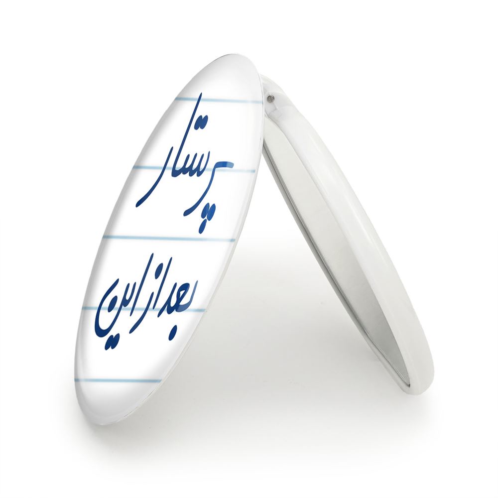 آینه های تاشو پرستار بعد از این خندالو، از جنس پلاستیک فشرده ABS تولید شده و به رنگ سفید می باشد. یکی از آینه ها ابعاد واقعی را نشان داده و دیگری با قابلیت بزرگنمایی، جزئیات را بهتر نمایش می دهد. ابعاد هر یک از آینه ها، دایره ای به قطر 7.5 سانت می باشد که نه خیلی بزرگ و غیر قابل استفاده در کیف آرایشی ست و نه خیلی کوچک که تصویر خاصی در آن مشاهده نشود. آینه تاشو پرستار بعد از این سایزی استاندارد و کارآمد دارد و در هر کیفی جا میگیرد. چاپ طرح بوسیله چاپگرهای دیجیتال شش رنگ با شفافیت و کیفیتی مثال زدنی بر روی یک وجه از بدنه ی آینه انجام گرفته و با روکش لمینت حرارتی پوشیده شده که در مقابل آسیب و خط و خش مقاوم بوده و کیفیت بالایی دارد. درب آینه بوسیله قفل بدنه ی آن، باز نمی ماند و کاملا بسته می شود و مناسب قرار گیری در کیف لوازم آرایش و کیف های کوچک دستی نیز هست. آینه های تاشو پرستار بعد از این خندالو با تنوع طرحی بسیار بالا، سلیقه هر نوع مخاطبی را تامین میکند.