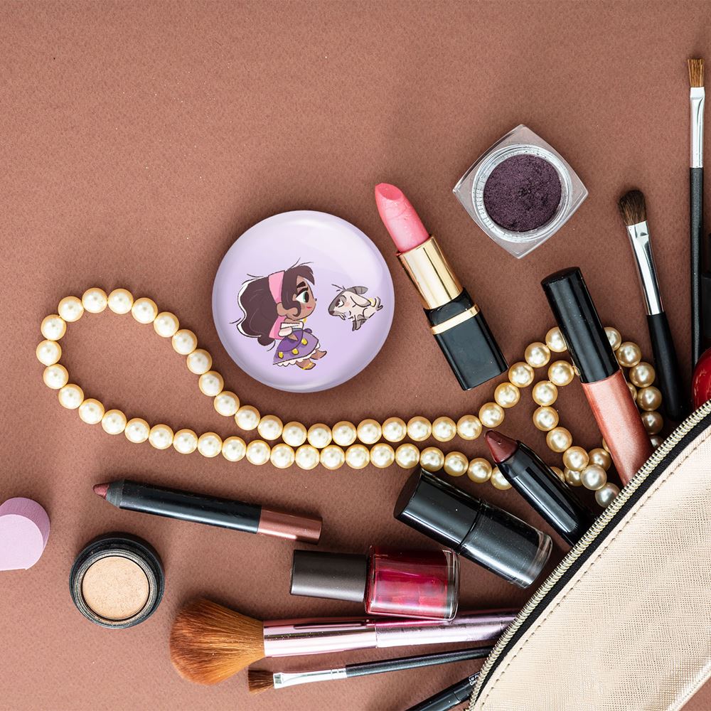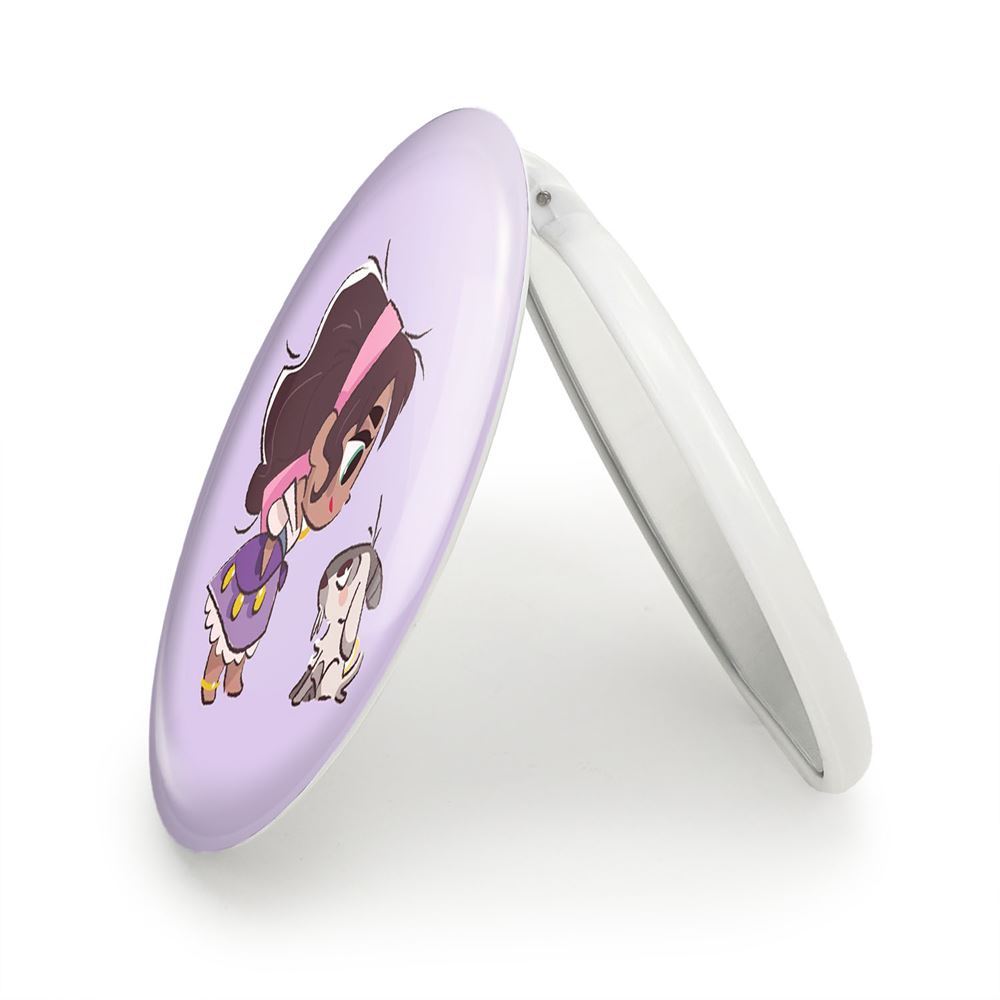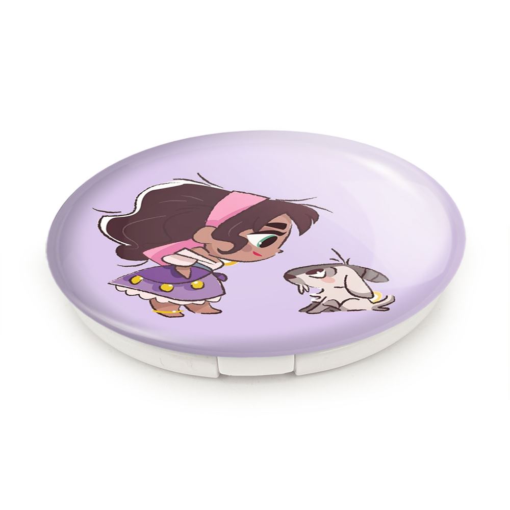 آینه های تاشو پرنسس دیزنی اسمرالدا خندالو، از جنس پلاستیک فشرده ABS تولید شده و به رنگ سفید می باشد. یکی از آینه ها ابعاد واقعی را نشان داده و دیگری با قابلیت بزرگنمایی، جزئیات را بهتر نمایش می دهد. ابعاد هر یک از آینه ها، دایره ای به قطر 7.5 سانت می باشد که نه خیلی بزرگ و غیر قابل استفاده در کیف آرایشی ست و نه خیلی کوچک که تصویر خاصی در آن مشاهده نشود. آینه تاشو پرنسس دیزنی اسمرالدا سایزی استاندارد و کارآمد دارد و در هر کیفی جا میگیرد. چاپ طرح بوسیله چاپگرهای دیجیتال شش رنگ با شفافیت و کیفیتی مثال زدنی بر روی یک وجه از بدنه ی آینه انجام گرفته و با روکش لمینت حرارتی پوشیده شده که در مقابل آسیب و خط و خش مقاوم بوده و کیفیت بالایی دارد. درب آینه بوسیله قفل بدنه ی آن، باز نمی ماند و کاملا بسته می شود و مناسب قرار گیری در کیف لوازم آرایش و کیف های کوچک دستی نیز هست. آینه های تاشو پرنسس دیزنی اسمرالدا خندالو با تنوع طرحی بسیار بالا، سلیقه هر نوع مخاطبی را تامین میکند.
