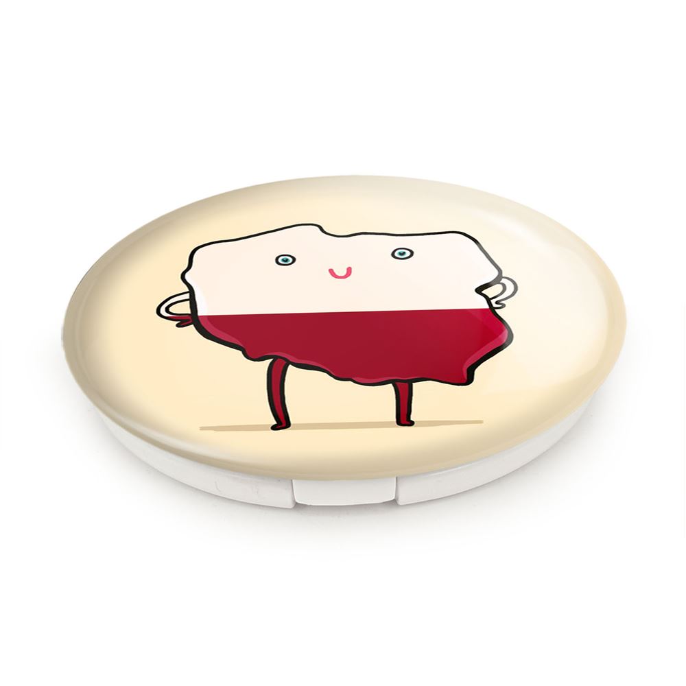 آینه های تاشو پرچم لهستان خندالو، از جنس پلاستیک فشرده ABS تولید شده و به رنگ سفید می باشد. یکی از آینه ها ابعاد واقعی را نشان داده و دیگری با قابلیت بزرگنمایی، جزئیات را بهتر نمایش می دهد. ابعاد هر یک از آینه ها، دایره ای به قطر 7.5 سانت می باشد که نه خیلی بزرگ و غیر قابل استفاده در کیف آرایشی ست و نه خیلی کوچک که تصویر خاصی در آن مشاهده نشود. آینه تاشو پرچم لهستان سایزی استاندارد و کارآمد دارد و در هر کیفی جا میگیرد. چاپ طرح بوسیله چاپگرهای دیجیتال شش رنگ با شفافیت و کیفیتی مثال زدنی بر روی یک وجه از بدنه ی آینه انجام گرفته و با روکش لمینت حرارتی پوشیده شده که در مقابل آسیب و خط و خش مقاوم بوده و کیفیت بالایی دارد. درب آینه بوسیله قفل بدنه ی آن، باز نمی ماند و کاملا بسته می شود و مناسب قرار گیری در کیف لوازم آرایش و کیف های کوچک دستی نیز هست. آینه های تاشو پرچم لهستان خندالو با تنوع طرحی بسیار بالا، سلیقه هر نوع مخاطبی را تامین میکند.