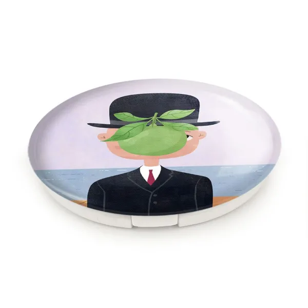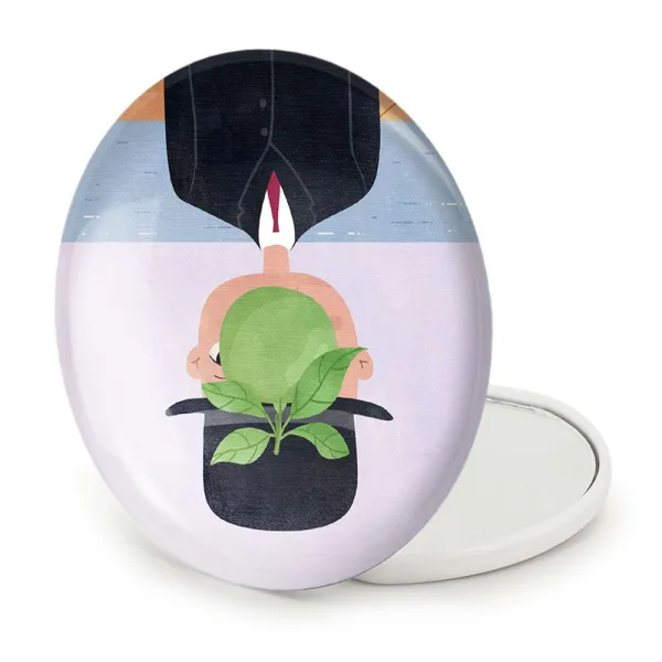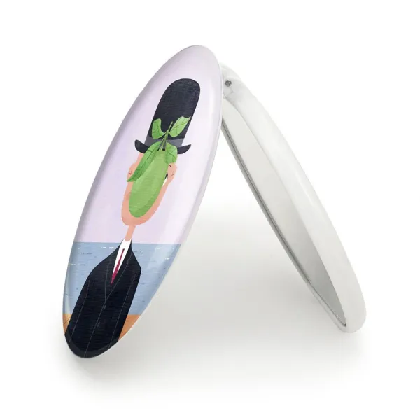 آینه های تاشو پسر انسان خندالو، از جنس پلاستیک فشرده ABS تولید شده و به رنگ سفید می باشد. یکی از آینه ها ابعاد واقعی را نشان داده و دیگری با قابلیت بزرگنمایی، جزئیات را بهتر نمایش می دهد. ابعاد هر یک از آینه ها، دایره ای به قطر 7.5 سانت می باشد که نه خیلی بزرگ و غیر قابل استفاده در کیف آرایشی ست و نه خیلی کوچک که تصویر خاصی در آن مشاهده نشود. آینه تاشو پسر انسان سایزی استاندارد و کارآمد دارد و در هر کیفی جا میگیرد. چاپ طرح بوسیله چاپگرهای دیجیتال شش رنگ با شفافیت و کیفیتی مثال زدنی بر روی یک وجه از بدنه ی آینه انجام گرفته و با روکش لمینت حرارتی پوشیده شده که در مقابل آسیب و خط و خش مقاوم بوده و کیفیت بالایی دارد. درب آینه بوسیله قفل بدنه ی آن، باز نمی ماند و کاملا بسته می شود و مناسب قرار گیری در کیف لوازم آرایش و کیف های کوچک دستی نیز هست. آینه های تاشو پسر انسان خندالو با تنوع طرحی بسیار بالا، سلیقه هر نوع مخاطبی را تامین میکند.