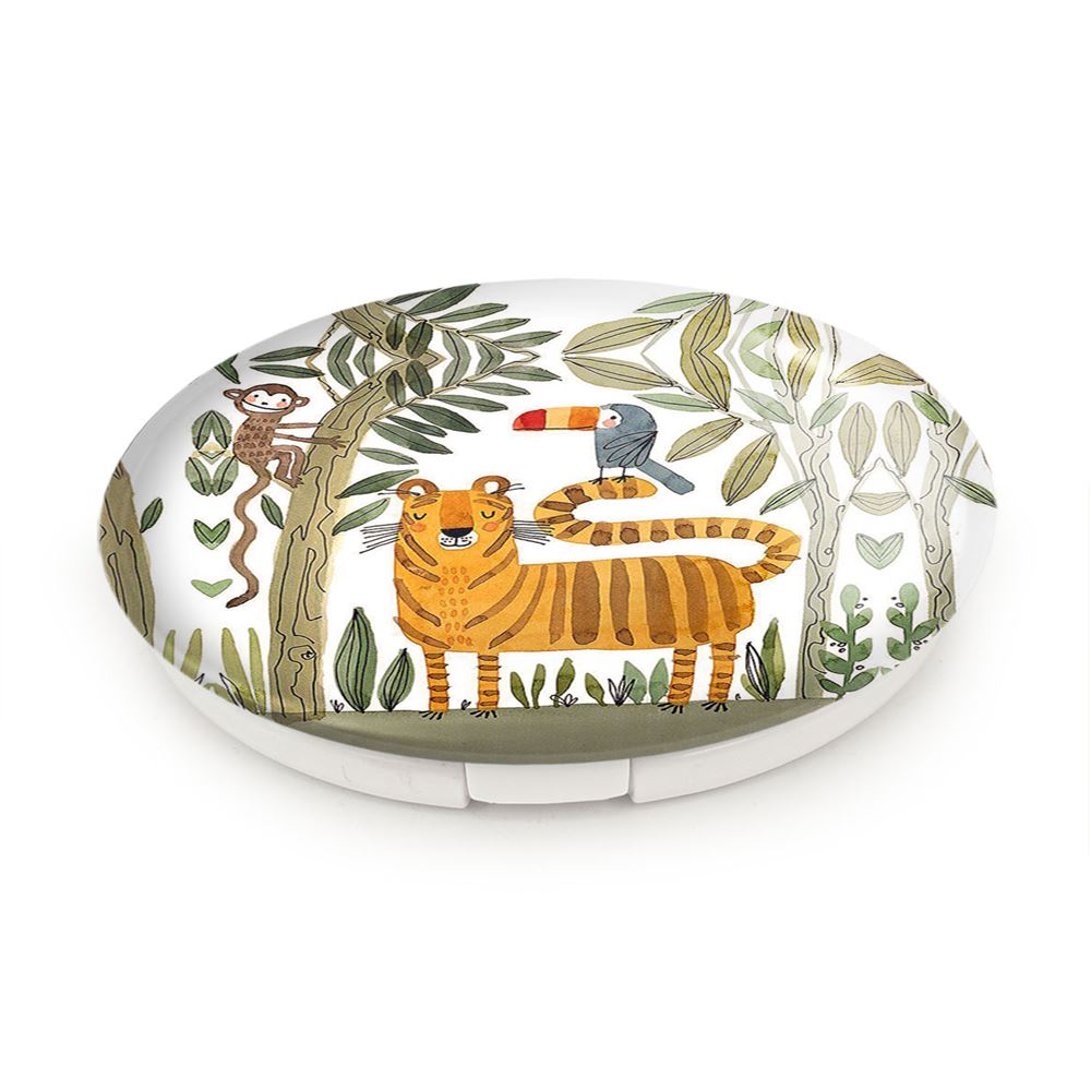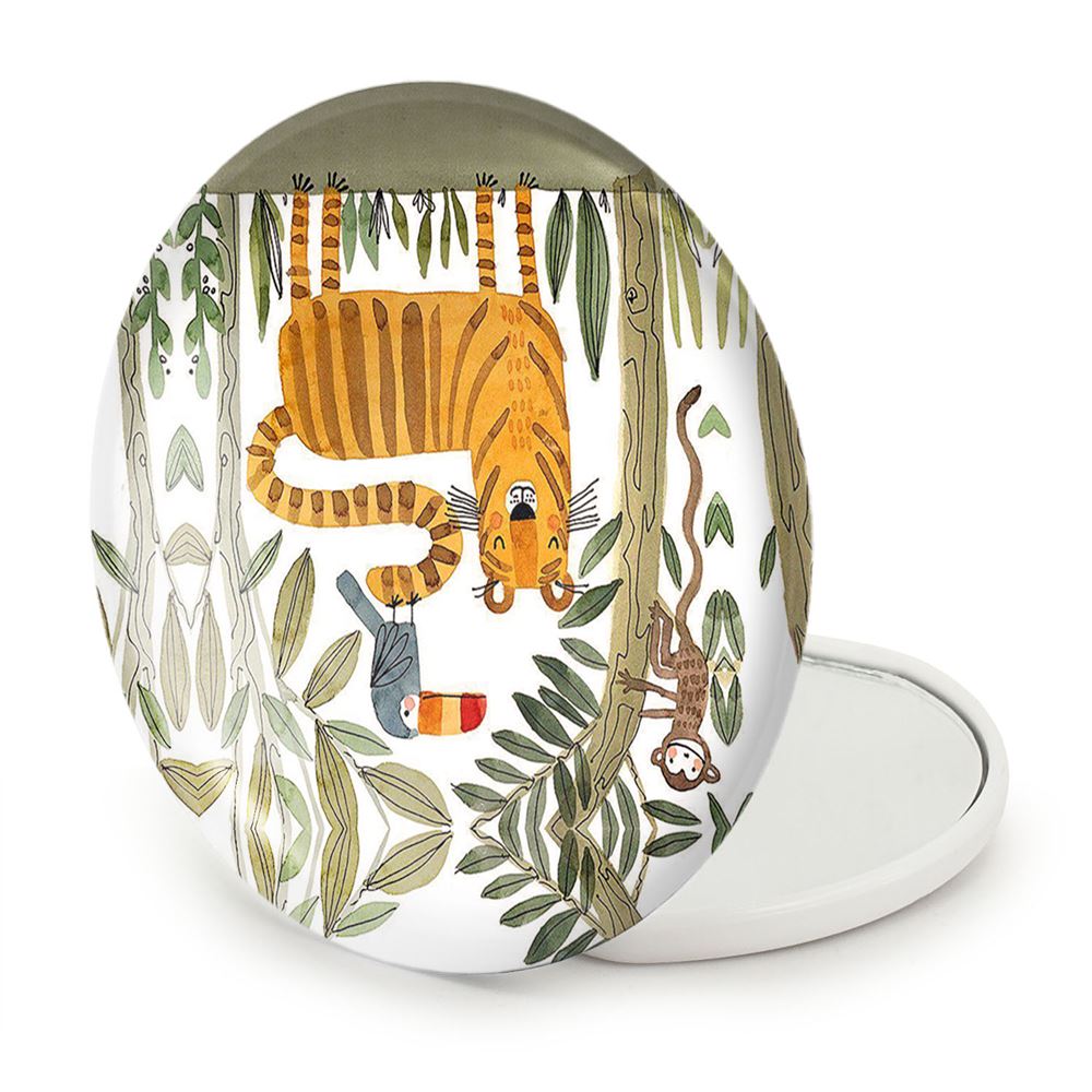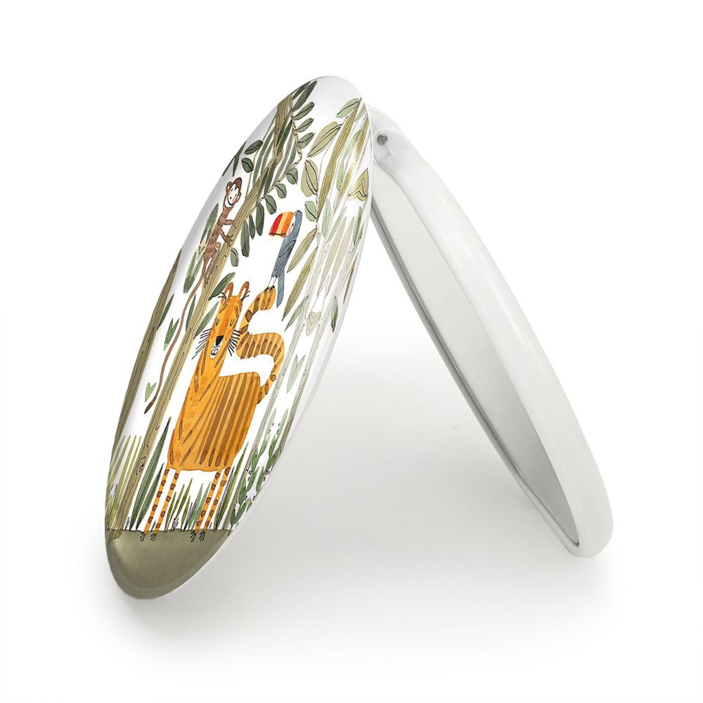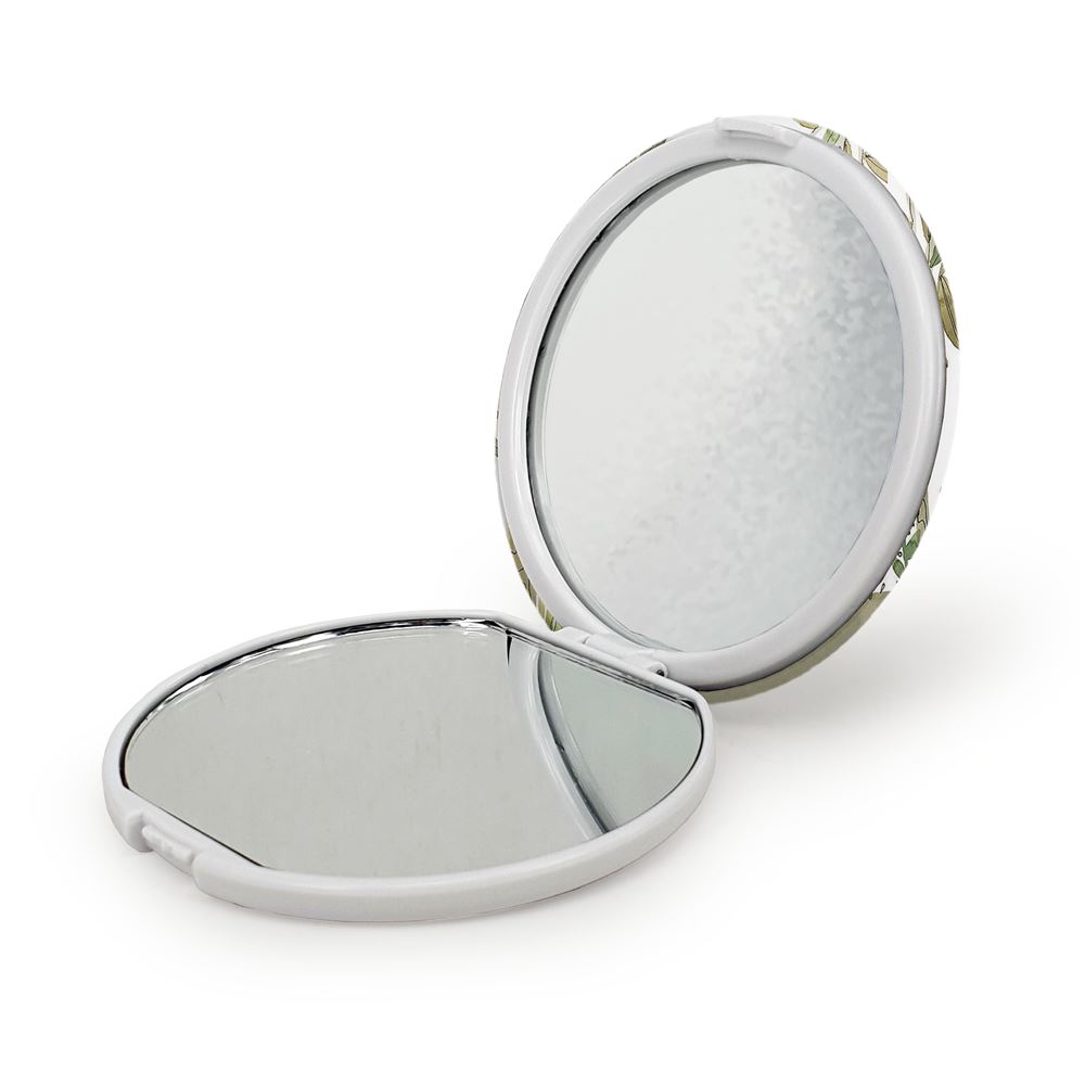 آینه های تاشو پلنگ خندالو، از جنس پلاستیک فشرده ABS تولید شده و به رنگ سفید می باشد. یکی از آینه ها ابعاد واقعی را نشان داده و دیگری با قابلیت بزرگنمایی، جزئیات را بهتر نمایش می دهد. ابعاد هر یک از آینه ها، دایره ای به قطر 7.5 سانت می باشد که نه خیلی بزرگ و غیر قابل استفاده در کیف آرایشی ست و نه خیلی کوچک که تصویر خاصی در آن مشاهده نشود. آینه تاشو پلنگ سایزی استاندارد و کارآمد دارد و در هر کیفی جا میگیرد. چاپ طرح بوسیله چاپگرهای دیجیتال شش رنگ با شفافیت و کیفیتی مثال زدنی بر روی یک وجه از بدنه ی آینه انجام گرفته و با روکش لمینت حرارتی پوشیده شده که در مقابل آسیب و خط و خش مقاوم بوده و کیفیت بالایی دارد. درب آینه بوسیله قفل بدنه ی آن، باز نمی ماند و کاملا بسته می شود و مناسب قرار گیری در کیف لوازم آرایش و کیف های کوچک دستی نیز هست. آینه های تاشو پلنگ خندالو با تنوع طرحی بسیار بالا، سلیقه هر نوع مخاطبی را تامین میکند.