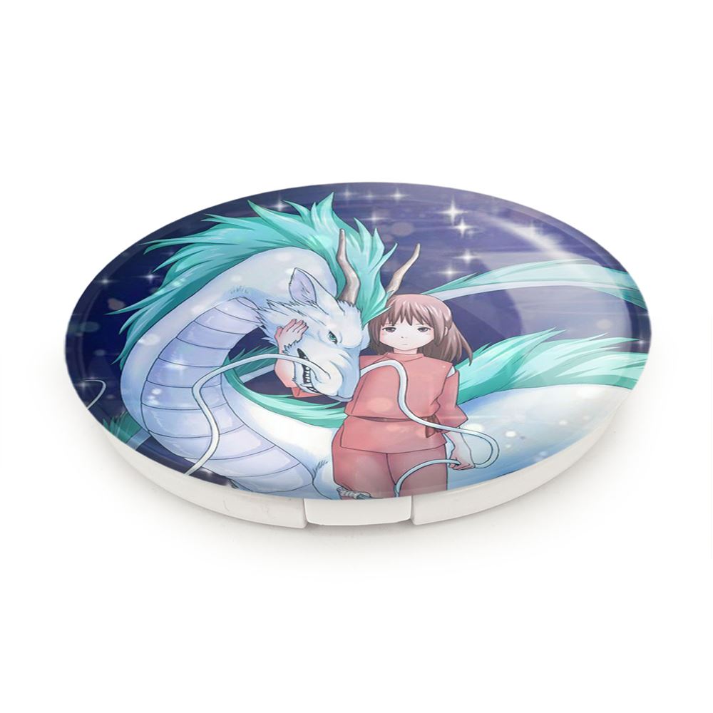 آینه های تاشو چیهیرو و هاکو انیمه شهر اشباح Spirited Away خندالو، از جنس پلاستیک فشرده ABS تولید شده و به رنگ سفید می باشد. یکی از آینه ها ابعاد واقعی را نشان داده و دیگری با قابلیت بزرگنمایی، جزئیات را بهتر نمایش می دهد.