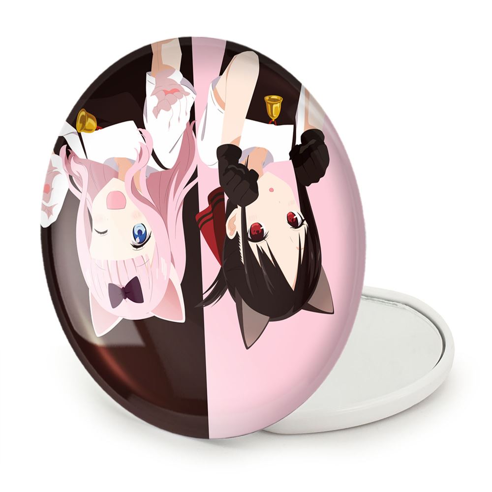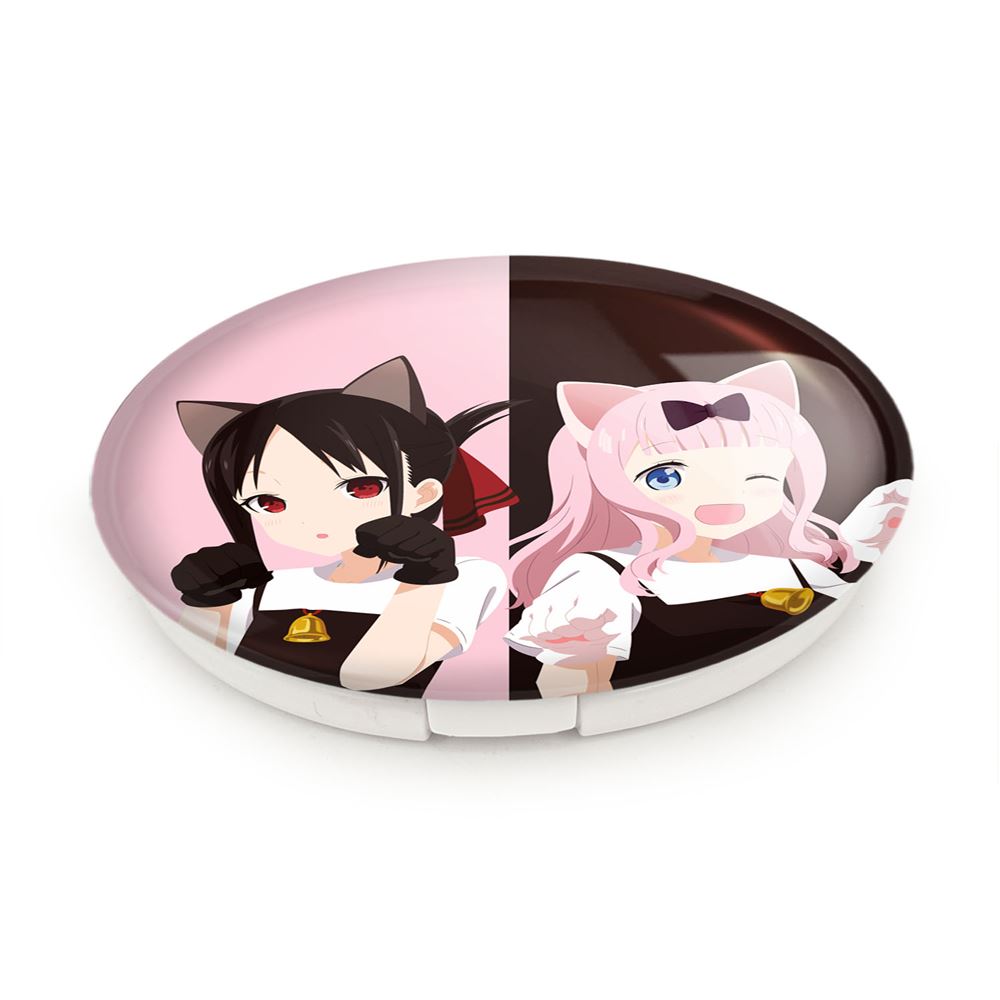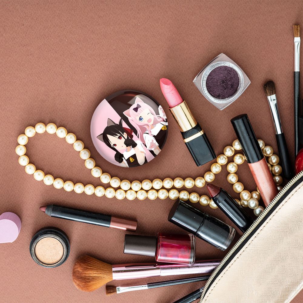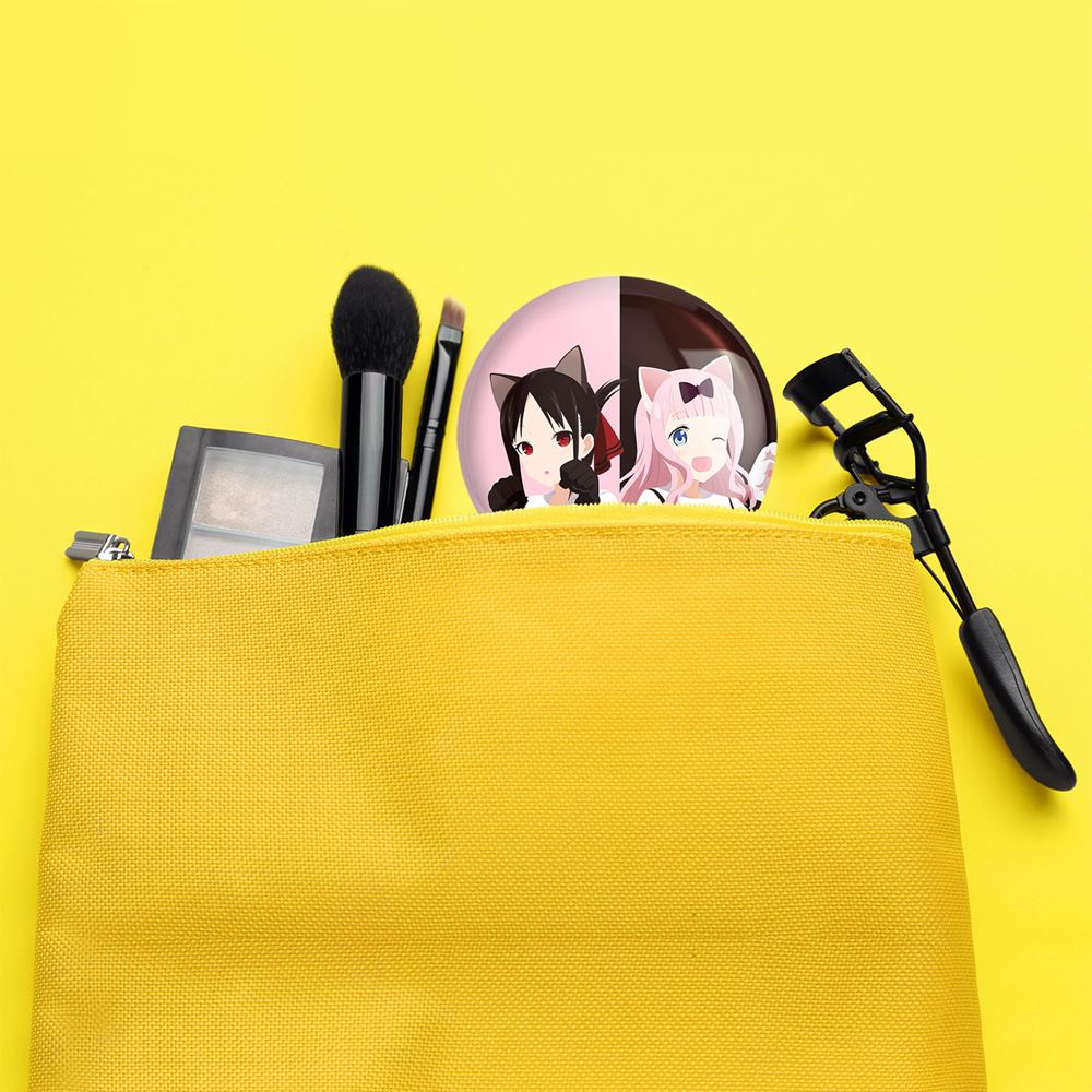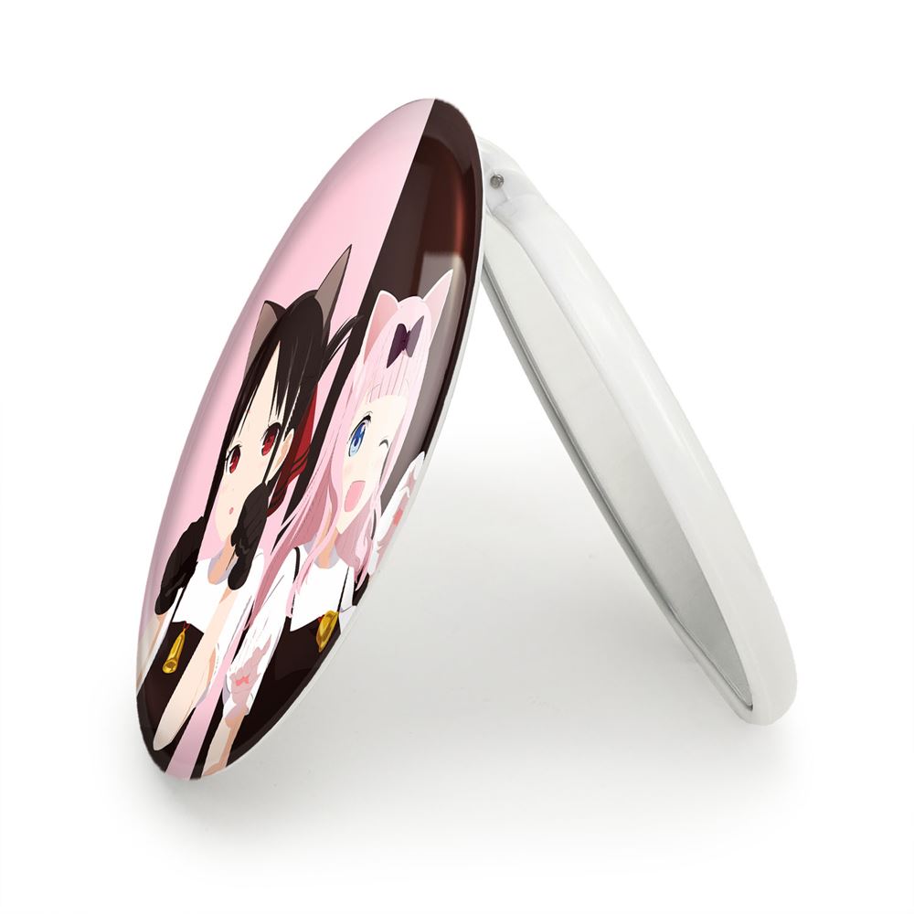 آینه های تاشو چیکا و کاگویا انیمه کاگویا ساما خندالو، از جنس پلاستیک فشرده ABS تولید شده و به رنگ سفید می باشد. یکی از آینه ها ابعاد واقعی را نشان داده و دیگری با قابلیت بزرگنمایی، جزئیات را بهتر نمایش می دهد. ابعاد هر یک از آینه ها، دایره ای به قطر 7.5 سانت می باشد که نه خیلی بزرگ و غیر قابل استفاده در کیف آرایشی ست و نه خیلی کوچک که تصویر خاصی در آن مشاهده نشود. آینه تاشو چیکا و کاگویا انیمه کاگویا ساما سایزی استاندارد و کارآمد دارد و در هر کیفی جا میگیرد. چاپ طرح بوسیله چاپگرهای دیجیتال شش رنگ با شفافیت و کیفیتی مثال زدنی بر روی یک وجه از بدنه ی آینه انجام گرفته و با روکش لمینت حرارتی پوشیده شده که در مقابل آسیب و خط و خش مقاوم بوده و کیفیت بالایی دارد. درب آینه بوسیله قفل بدنه ی آن، باز نمی ماند و کاملا بسته می شود و مناسب قرار گیری در کیف لوازم آرایش و کیف های کوچک دستی نیز هست. آینه های تاشو چیکا و کاگویا انیمه کاگویا ساما خندالو با تنوع طرحی بسیار بالا، سلیقه هر نوع مخاطبی را تامین میکند.