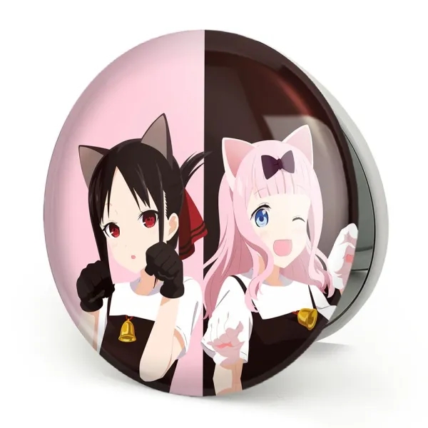 آینه های تاشو چیکا و کاگویا انیمه کاگویا ساما خندالو، از جنس پلاستیک فشرده ABS تولید شده و به رنگ سفید می باشد. یکی از آینه ها ابعاد واقعی را نشان داده و دیگری با قابلیت بزرگنمایی، جزئیات را بهتر نمایش می دهد. ابعاد هر یک از آینه ها، دایره ای به قطر 7.5 سانت می باشد که نه خیلی بزرگ و غیر قابل استفاده در کیف آرایشی ست و نه خیلی کوچک که تصویر خاصی در آن مشاهده نشود. آینه تاشو چیکا و کاگویا انیمه کاگویا ساما سایزی استاندارد و کارآمد دارد و در هر کیفی جا میگیرد. چاپ طرح بوسیله چاپگرهای دیجیتال شش رنگ با شفافیت و کیفیتی مثال زدنی بر روی یک وجه از بدنه ی آینه انجام گرفته و با روکش لمینت حرارتی پوشیده شده که در مقابل آسیب و خط و خش مقاوم بوده و کیفیت بالایی دارد. درب آینه بوسیله قفل بدنه ی آن، باز نمی ماند و کاملا بسته می شود و مناسب قرار گیری در کیف لوازم آرایش و کیف های کوچک دستی نیز هست. آینه های تاشو چیکا و کاگویا انیمه کاگویا ساما خندالو با تنوع طرحی بسیار بالا، سلیقه هر نوع مخاطبی را تامین میکند.