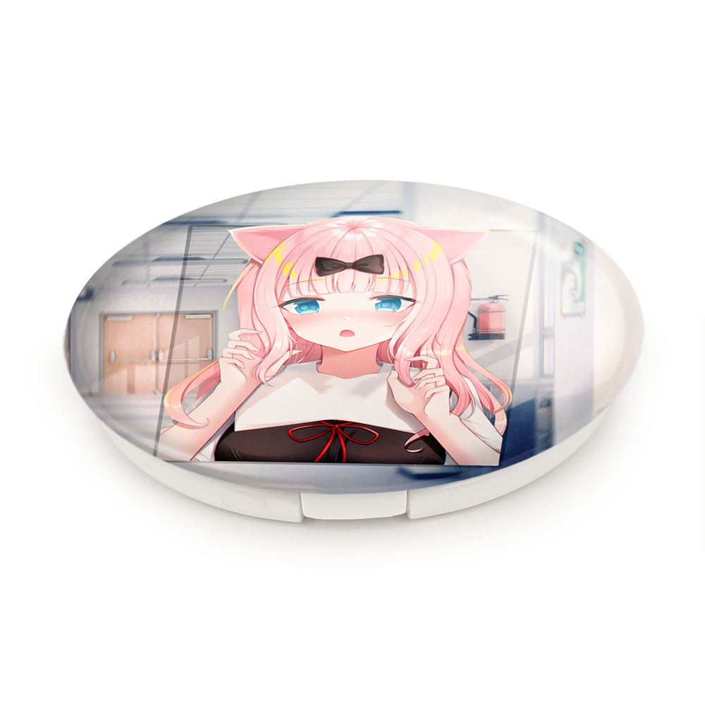 آینه های تاشو چیکا چان انیمه کاگویا ساما خندالو، از جنس پلاستیک فشرده ABS تولید شده و به رنگ سفید می باشد. یکی از آینه ها ابعاد واقعی را نشان داده و دیگری با قابلیت بزرگنمایی، جزئیات را بهتر نمایش می دهد. ابعاد هر یک از آینه ها، دایره ای به قطر 7.5 سانت می باشد که نه خیلی بزرگ و غیر قابل استفاده در کیف آرایشی ست و نه خیلی کوچک که تصویر خاصی در آن مشاهده نشود. آینه تاشو چیکا چان انیمه کاگویا ساما سایزی استاندارد و کارآمد دارد و در هر کیفی جا میگیرد. چاپ طرح بوسیله چاپگرهای دیجیتال شش رنگ با شفافیت و کیفیتی مثال زدنی بر روی یک وجه از بدنه ی آینه انجام گرفته و با روکش لمینت حرارتی پوشیده شده که در مقابل آسیب و خط و خش مقاوم بوده و کیفیت بالایی دارد. درب آینه بوسیله قفل بدنه ی آن، باز نمی ماند و کاملا بسته می شود و مناسب قرار گیری در کیف لوازم آرایش و کیف های کوچک دستی نیز هست. آینه های تاشو چیکا چان انیمه کاگویا ساما خندالو با تنوع طرحی بسیار بالا، سلیقه هر نوع مخاطبی را تامین میکند.