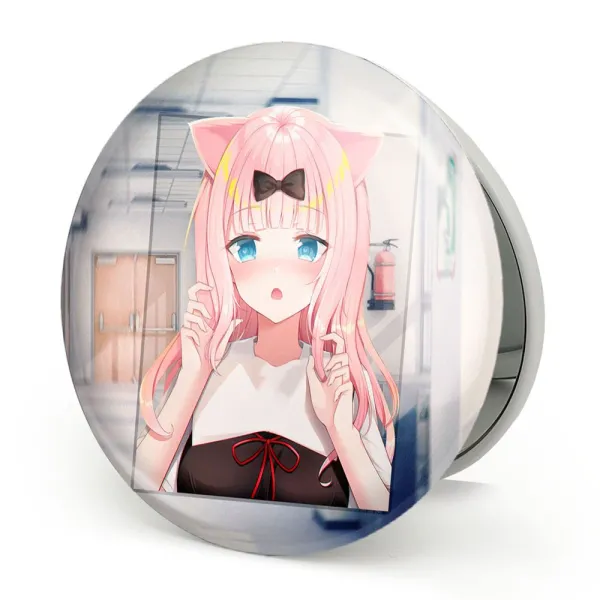 آینه های تاشو چیکا چان انیمه کاگویا ساما خندالو، از جنس پلاستیک فشرده ABS تولید شده و به رنگ سفید می باشد. یکی از آینه ها ابعاد واقعی را نشان داده و دیگری با قابلیت بزرگنمایی، جزئیات را بهتر نمایش می دهد. ابعاد هر یک از آینه ها، دایره ای به قطر 7.5 سانت می باشد که نه خیلی بزرگ و غیر قابل استفاده در کیف آرایشی ست و نه خیلی کوچک که تصویر خاصی در آن مشاهده نشود. آینه تاشو چیکا چان انیمه کاگویا ساما سایزی استاندارد و کارآمد دارد و در هر کیفی جا میگیرد. چاپ طرح بوسیله چاپگرهای دیجیتال شش رنگ با شفافیت و کیفیتی مثال زدنی بر روی یک وجه از بدنه ی آینه انجام گرفته و با روکش لمینت حرارتی پوشیده شده که در مقابل آسیب و خط و خش مقاوم بوده و کیفیت بالایی دارد. درب آینه بوسیله قفل بدنه ی آن، باز نمی ماند و کاملا بسته می شود و مناسب قرار گیری در کیف لوازم آرایش و کیف های کوچک دستی نیز هست. آینه های تاشو چیکا چان انیمه کاگویا ساما خندالو با تنوع طرحی بسیار بالا، سلیقه هر نوع مخاطبی را تامین میکند.