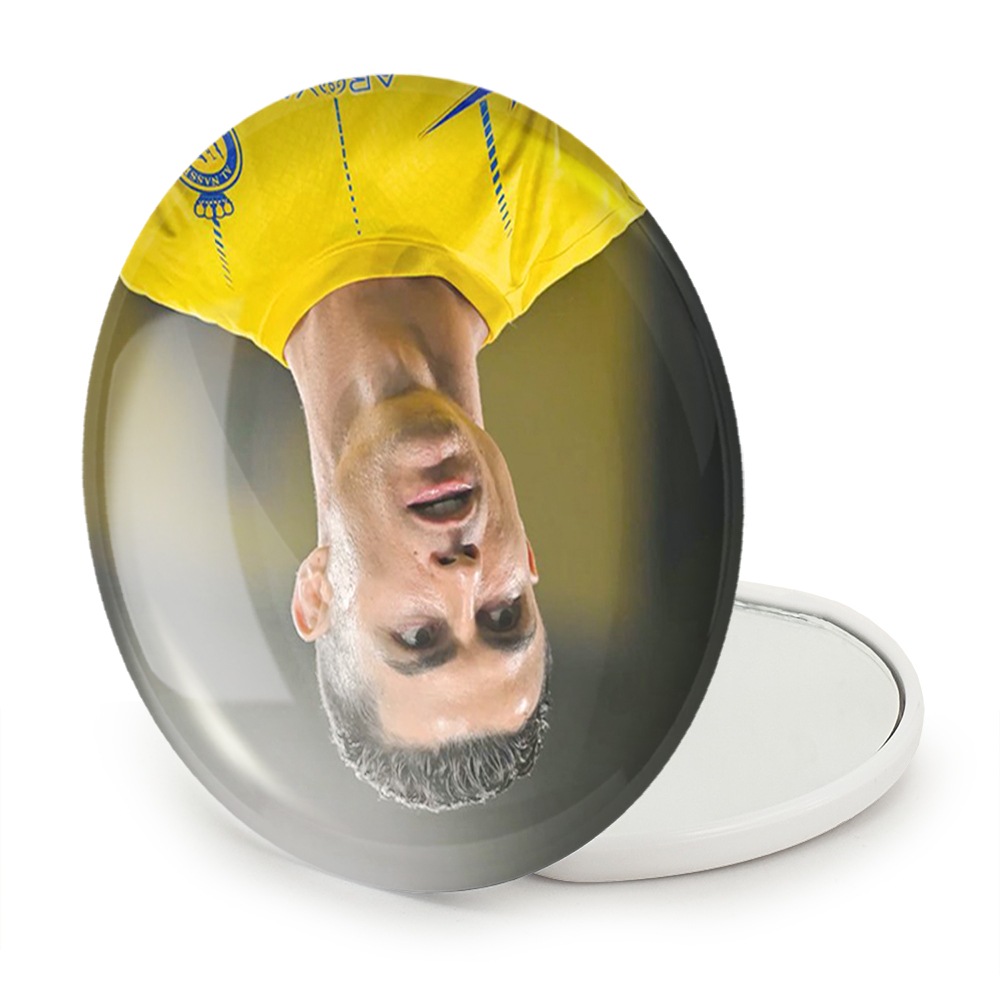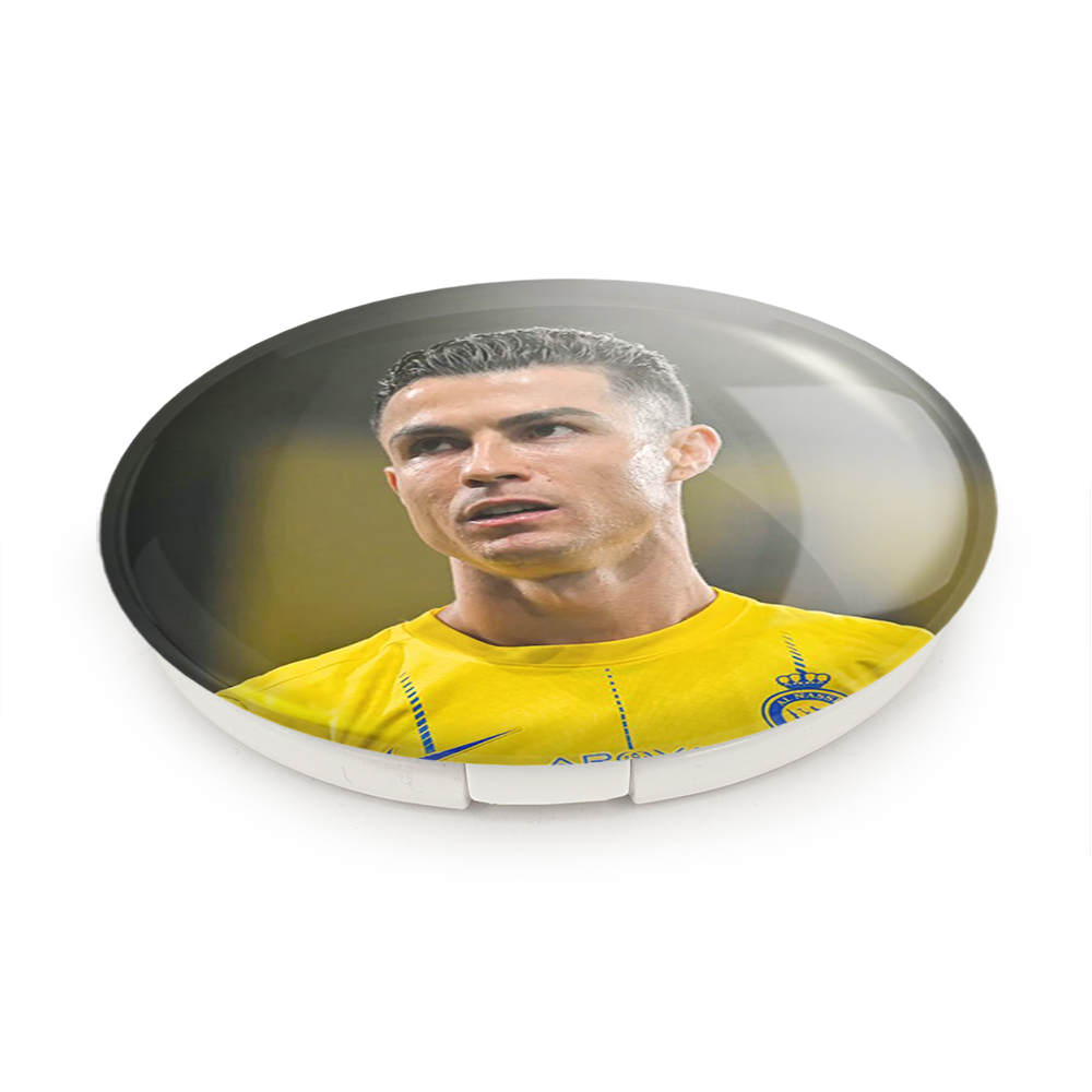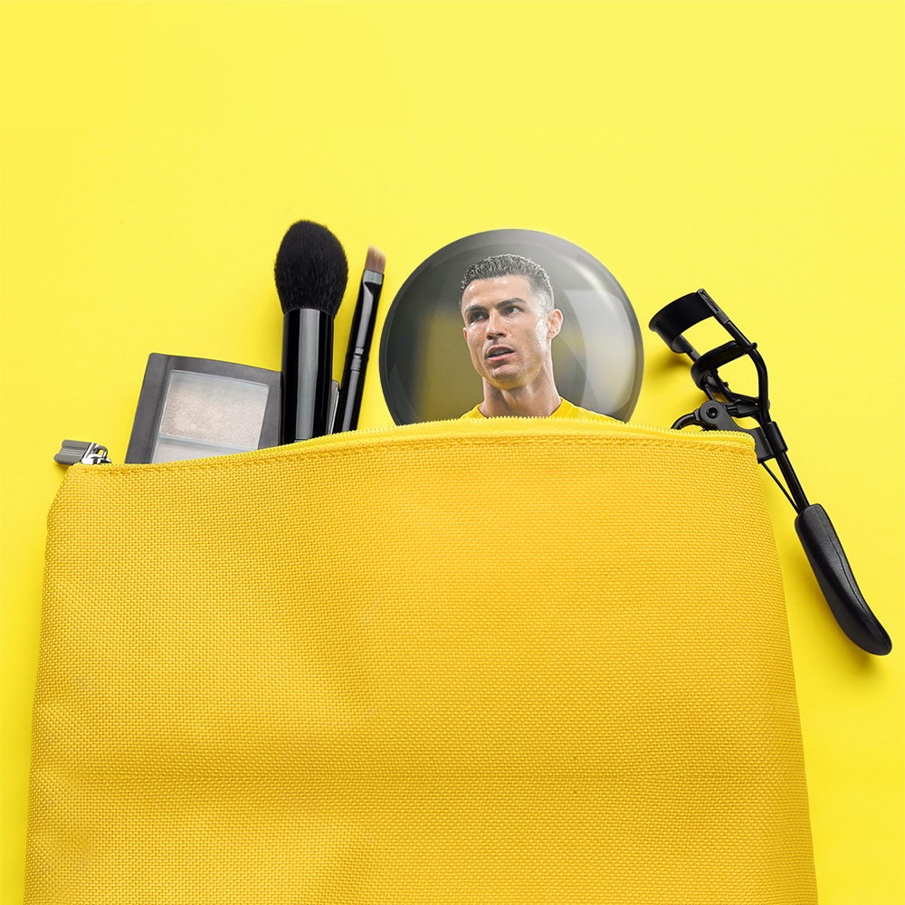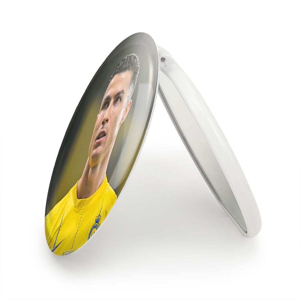 آینه های تاشو کریستیانو رونالدو خندالو، از جنس پلاستیک فشرده ABS تولید شده و به رنگ سفید می باشد. یکی از آینه ها ابعاد واقعی را نشان داده و دیگری با قابلیت بزرگنمایی، جزئیات را بهتر نمایش می دهد. ابعاد هر یک از آینه ها، دایره ای به قطر 7.5 سانت می باشد که نه خیلی بزرگ و غیر قابل استفاده در کیف آرایشی ست و نه خیلی کوچک که تصویر خاصی در آن مشاهده نشود. آینه تاشو کریستیانو رونالدو سایزی استاندارد و کارآمد دارد و در هر کیفی جا میگیرد. چاپ طرح بوسیله چاپگرهای دیجیتال شش رنگ با شفافیت و کیفیتی مثال زدنی بر روی یک وجه از بدنه ی آینه انجام گرفته و با روکش لمینت حرارتی پوشیده شده که در مقابل آسیب و خط و خش مقاوم بوده و کیفیت بالایی دارد. درب آینه بوسیله قفل بدنه ی آن، باز نمی ماند و کاملا بسته می شود و مناسب قرار گیری در کیف لوازم آرایش و کیف های کوچک دستی نیز هست. آینه های تاشو کریستیانو رونالدو خندالو با تنوع طرحی بسیار بالا، سلیقه هر نوع مخاطبی را تامین میکند.