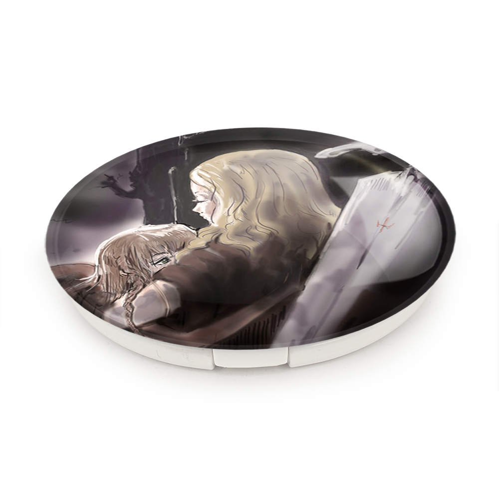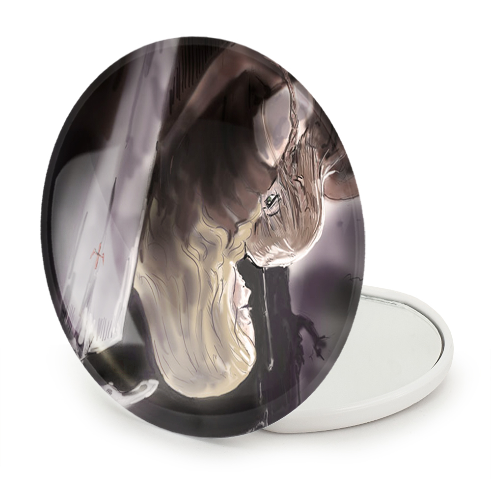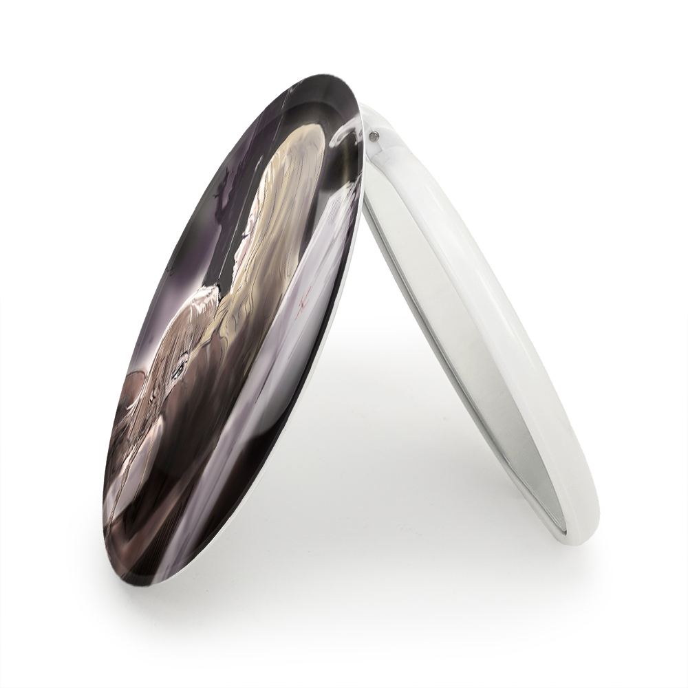 آینه های تاشو کلر انیمه کلیمور خندالو، از جنس پلاستیک فشرده ABS تولید شده و به رنگ سفید می باشد. یکی از آینه ها ابعاد واقعی را نشان داده و دیگری با قابلیت بزرگنمایی، جزئیات را بهتر نمایش می دهد. ابعاد هر یک از آینه ها، دایره ای به قطر 7.5 سانت می باشد که نه خیلی بزرگ و غیر قابل استفاده در کیف آرایشی ست و نه خیلی کوچک که تصویر خاصی در آن مشاهده نشود. آینه تاشو کلر انیمه کلیمور سایزی استاندارد و کارآمد دارد و در هر کیفی جا میگیرد. چاپ طرح بوسیله چاپگرهای دیجیتال شش رنگ با شفافیت و کیفیتی مثال زدنی بر روی یک وجه از بدنه ی آینه انجام گرفته و با روکش لمینت حرارتی پوشیده شده که در مقابل آسیب و خط و خش مقاوم بوده و کیفیت بالایی دارد. درب آینه بوسیله قفل بدنه ی آن، باز نمی ماند و کاملا بسته می شود و مناسب قرار گیری در کیف لوازم آرایش و کیف های کوچک دستی نیز هست. آینه های تاشو کلر انیمه کلیمور خندالو با تنوع طرحی بسیار بالا، سلیقه هر نوع مخاطبی را تامین میکند.