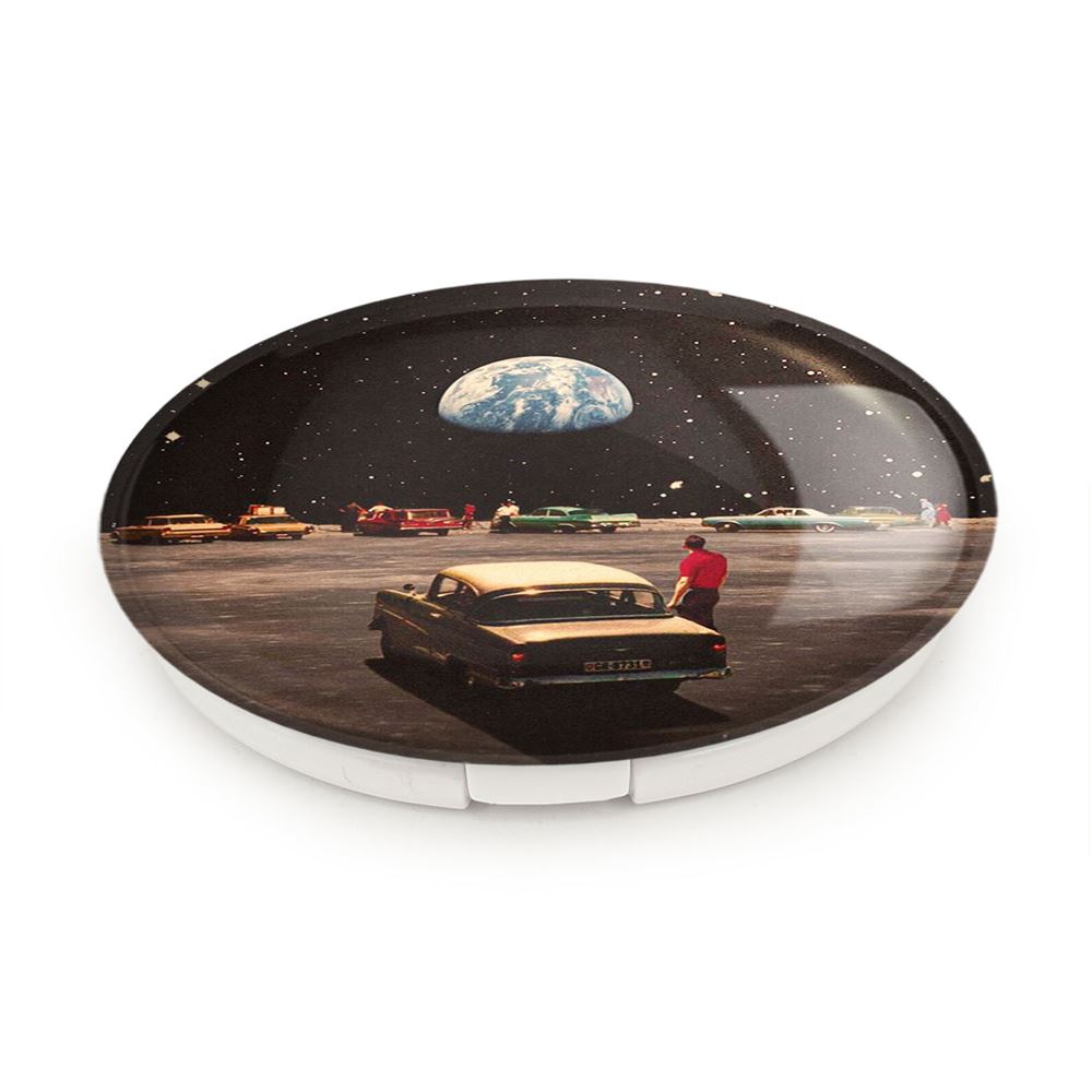 آینه های تاشو کهکشان خندالو، از جنس پلاستیک فشرده ABS تولید شده و به رنگ سفید می باشد. یکی از آینه ها ابعاد واقعی را نشان داده و دیگری با قابلیت بزرگنمایی، جزئیات را بهتر نمایش می دهد. ابعاد هر یک از آینه ها، دایره ای به قطر 7.5 سانت می باشد که نه خیلی بزرگ و غیر قابل استفاده در کیف آرایشی ست و نه خیلی کوچک که تصویر خاصی در آن مشاهده نشود. آینه تاشو کهکشان سایزی استاندارد و کارآمد دارد و در هر کیفی جا میگیرد. چاپ طرح بوسیله چاپگرهای دیجیتال شش رنگ با شفافیت و کیفیتی مثال زدنی بر روی یک وجه از بدنه ی آینه انجام گرفته و با روکش لمینت حرارتی پوشیده شده که در مقابل آسیب و خط و خش مقاوم بوده و کیفیت بالایی دارد. درب آینه بوسیله قفل بدنه ی آن، باز نمی ماند و کاملا بسته می شود و مناسب قرار گیری در کیف لوازم آرایش و کیف های کوچک دستی نیز هست. آینه های تاشو کهکشان خندالو با تنوع طرحی بسیار بالا، سلیقه هر نوع مخاطبی را تامین میکند.