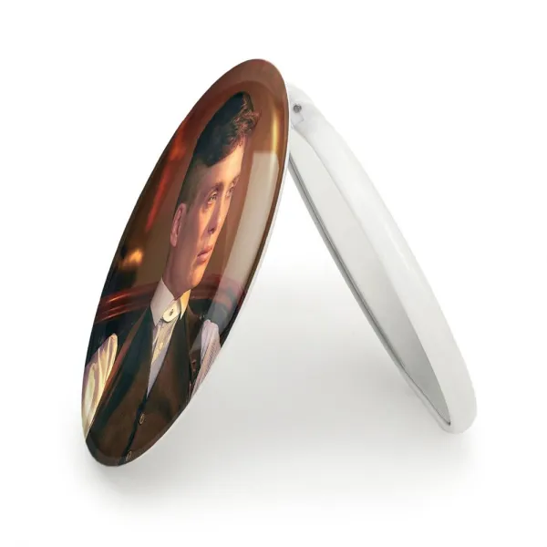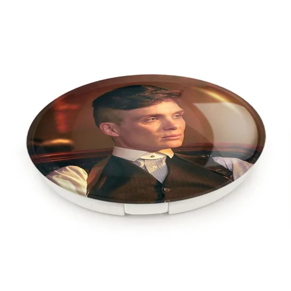 آینه های تاشو کیلین مورفی سریال پیکی بلایندرز Peaky Blinders خندالو، از جنس پلاستیک فشرده ABS تولید شده و به رنگ سفید می باشد. یکی از آینه ها ابعاد واقعی را نشان داده و دیگری با قابلیت بزرگنمایی، جزئیات را بهتر نمایش می دهد. ابعاد هر یک از آینه ها، دایره ای به قطر 7.5 سانت می باشد که نه خیلی بزرگ و غیر قابل استفاده در کیف آرایشی ست و نه خیلی کوچک که تصویر خاصی در آن مشاهده نشود. آینه تاشو کیلین مورفی سریال پیکی بلایندرز Peaky Blinders سایزی استاندارد و کارآمد دارد و در هر کیفی جا میگیرد. چاپ طرح بوسیله چاپگرهای دیجیتال شش رنگ با شفافیت و کیفیتی مثال زدنی بر روی یک وجه از بدنه ی آینه انجام گرفته و با روکش لمینت حرارتی پوشیده شده که در مقابل آسیب و خط و خش مقاوم بوده و کیفیت بالایی دارد. درب آینه بوسیله قفل بدنه ی آن، باز نمی ماند و کاملا بسته می شود و مناسب قرار گیری در کیف لوازم آرایش و کیف های کوچک دستی نیز هست. آینه های تاشو کیلین مورفی سریال پیکی بلایندرز Peaky Blinders خندالو با تنوع طرحی بسیار بالا، سلیقه هر نوع مخاطبی را تامین میکند.