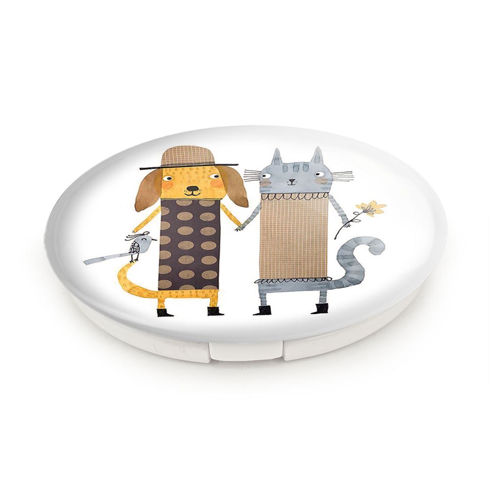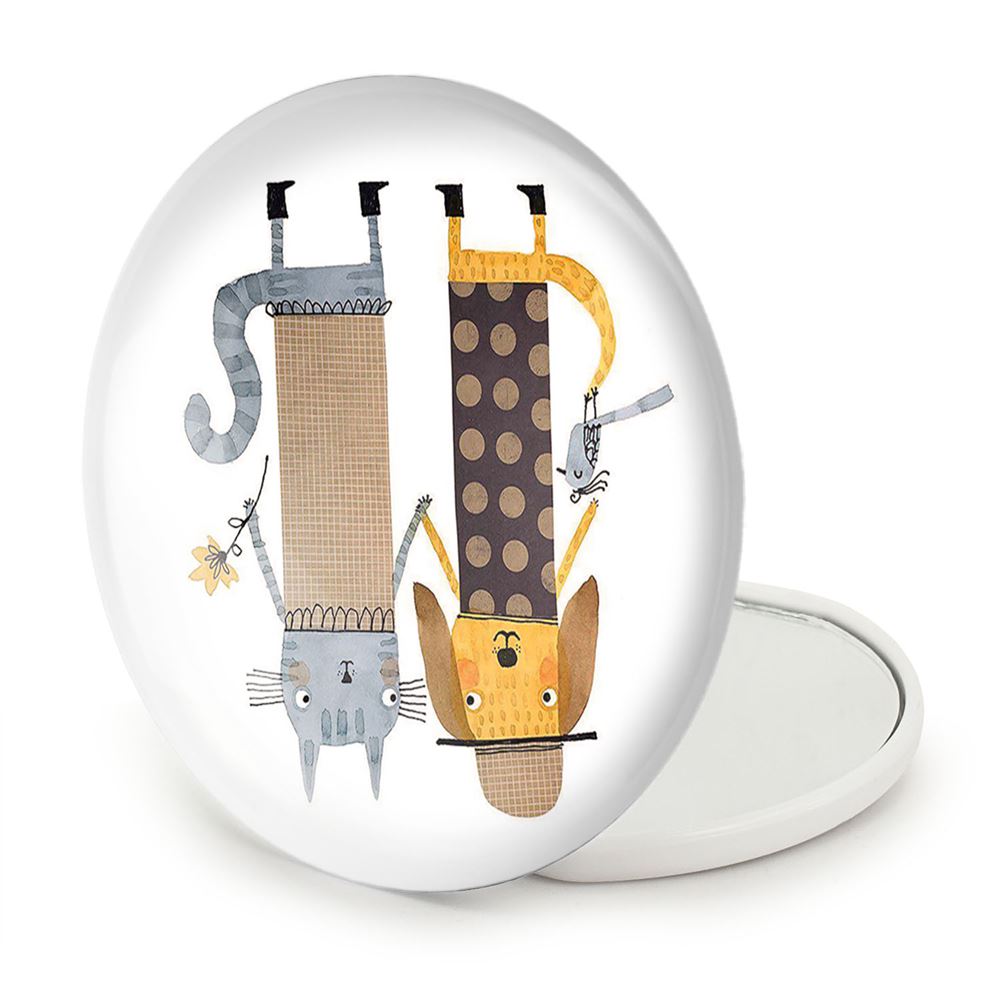 آینه های تاشو گربه و سگ خندالو، از جنس پلاستیک فشرده ABS تولید شده و به رنگ سفید می باشد. یکی از آینه ها ابعاد واقعی را نشان داده و دیگری با قابلیت بزرگنمایی، جزئیات را بهتر نمایش می دهد. ابعاد هر یک از آینه ها، دایره ای به قطر 7.5 سانت می باشد که نه خیلی بزرگ و غیر قابل استفاده در کیف آرایشی ست و نه خیلی کوچک که تصویر خاصی در آن مشاهده نشود. آینه تاشو گربه و سگ سایزی استاندارد و کارآمد دارد و در هر کیفی جا میگیرد. چاپ طرح بوسیله چاپگرهای دیجیتال شش رنگ با شفافیت و کیفیتی مثال زدنی بر روی یک وجه از بدنه ی آینه انجام گرفته و با روکش لمینت حرارتی پوشیده شده که در مقابل آسیب و خط و خش مقاوم بوده و کیفیت بالایی دارد. درب آینه بوسیله قفل بدنه ی آن، باز نمی ماند و کاملا بسته می شود و مناسب قرار گیری در کیف لوازم آرایش و کیف های کوچک دستی نیز هست. آینه های تاشو گربه و سگ خندالو با تنوع طرحی بسیار بالا، سلیقه هر نوع مخاطبی را تامین میکند.