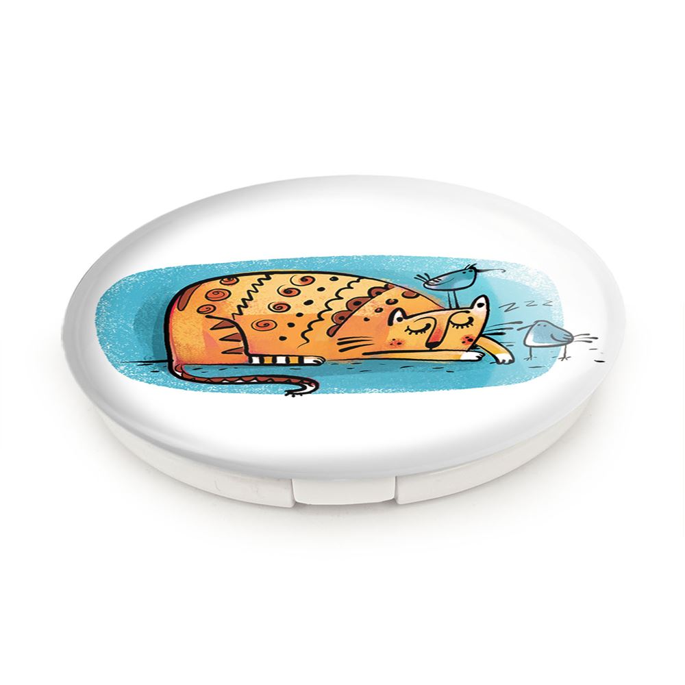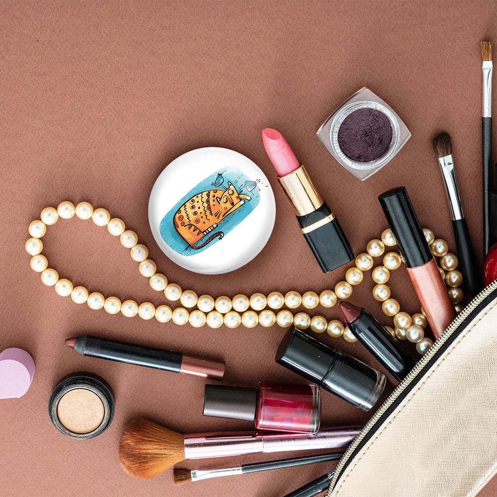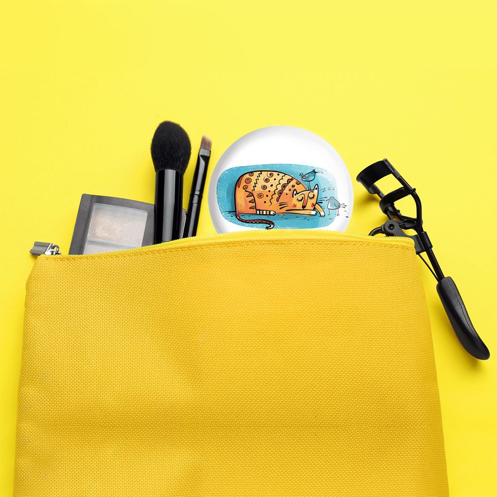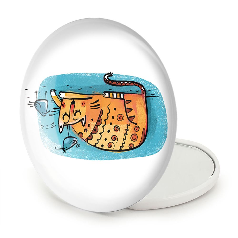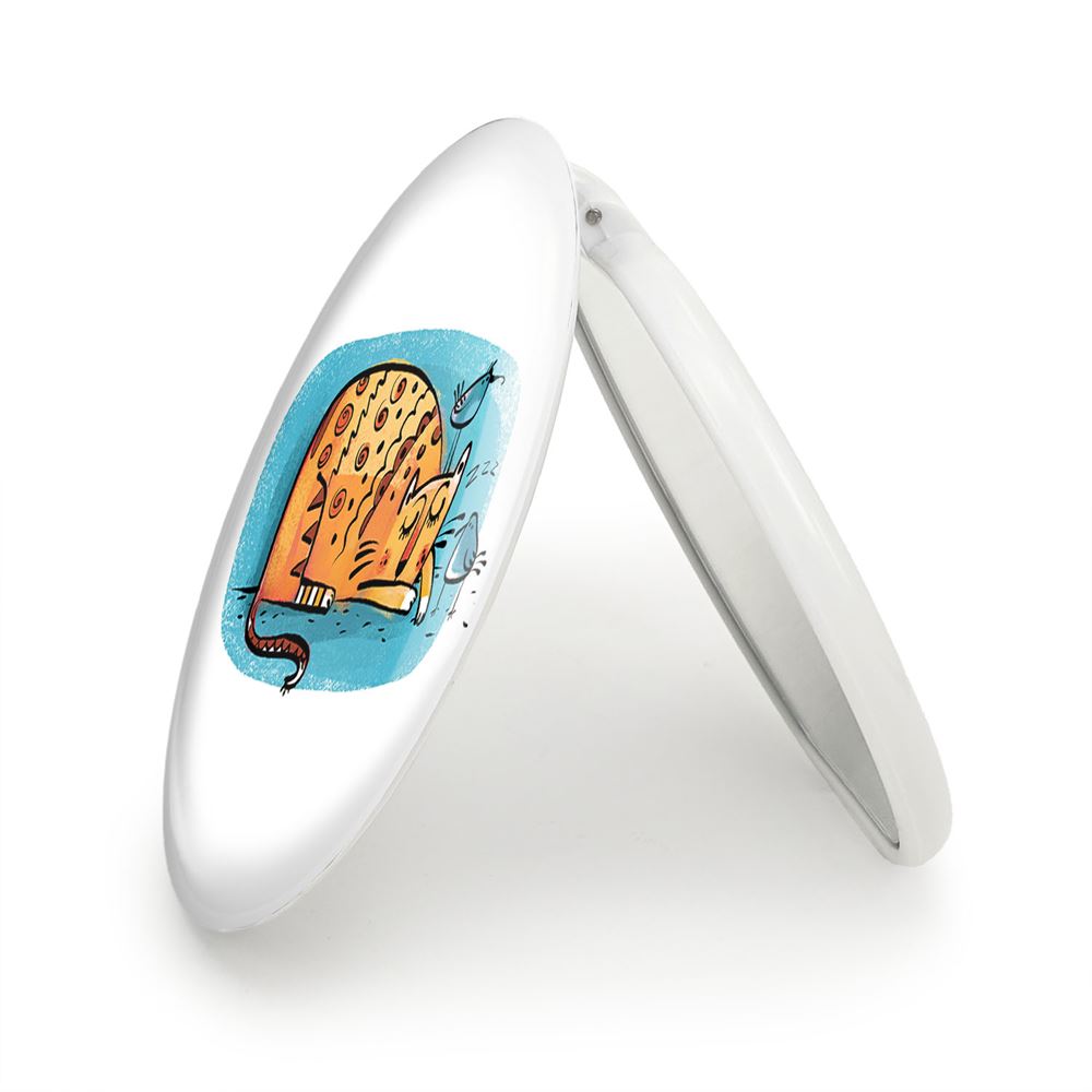 آینه های تاشو گربه خندالو، از جنس پلاستیک فشرده ABS تولید شده و به رنگ سفید می باشد. یکی از آینه ها ابعاد واقعی را نشان داده و دیگری با قابلیت بزرگنمایی، جزئیات را بهتر نمایش می دهد. ابعاد هر یک از آینه ها، دایره ای به قطر 7.5 سانت می باشد که نه خیلی بزرگ و غیر قابل استفاده در کیف آرایشی ست و نه خیلی کوچک که تصویر خاصی در آن مشاهده نشود. آینه تاشو گربه سایزی استاندارد و کارآمد دارد و در هر کیفی جا میگیرد. چاپ طرح بوسیله چاپگرهای دیجیتال شش رنگ با شفافیت و کیفیتی مثال زدنی بر روی یک وجه از بدنه ی آینه انجام گرفته و با روکش لمینت حرارتی پوشیده شده که در مقابل آسیب و خط و خش مقاوم بوده و کیفیت بالایی دارد. درب آینه بوسیله قفل بدنه ی آن، باز نمی ماند و کاملا بسته می شود و مناسب قرار گیری در کیف لوازم آرایش و کیف های کوچک دستی نیز هست. آینه های تاشو گربه خندالو با تنوع طرحی بسیار بالا، سلیقه هر نوع مخاطبی را تامین میکند.