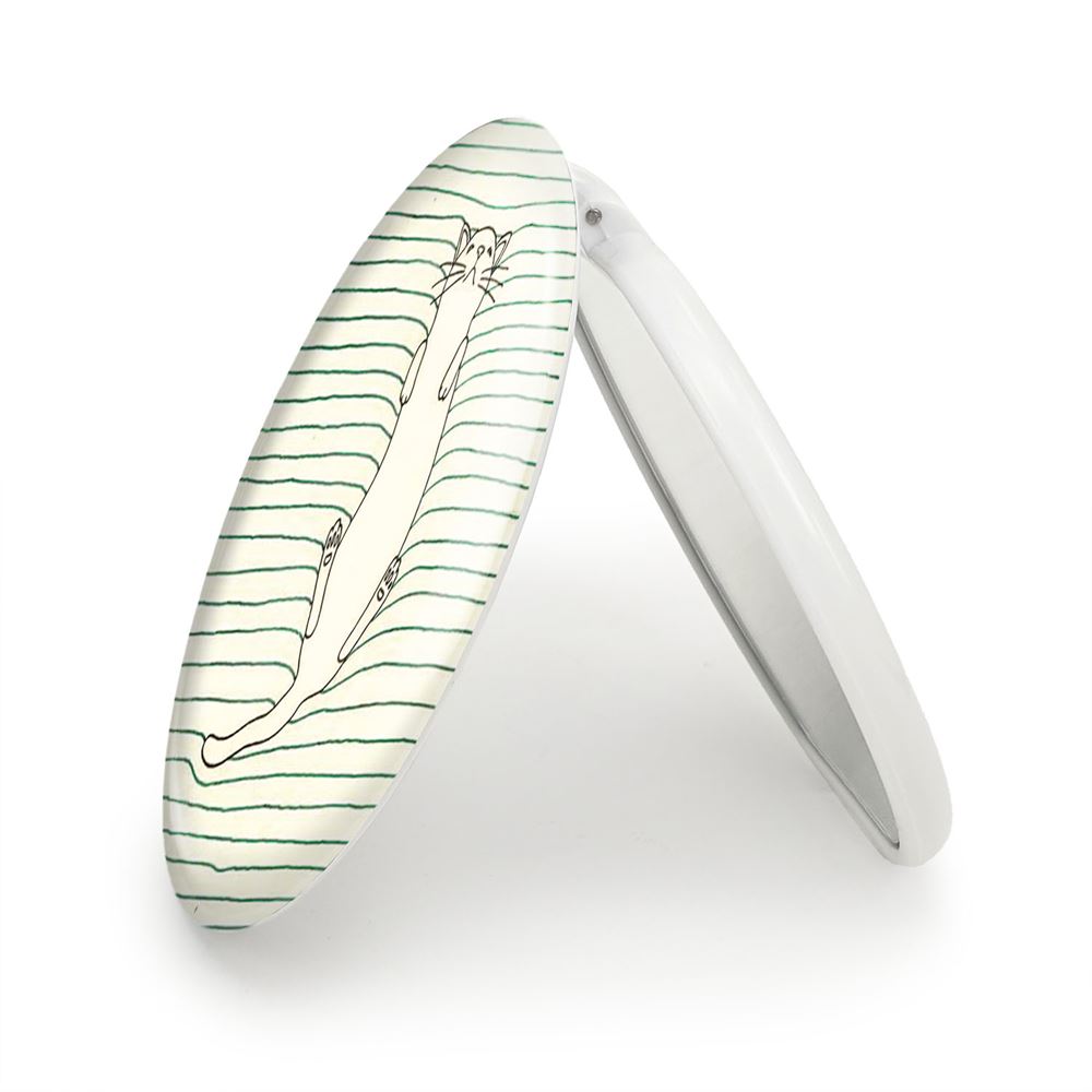 آینه های تاشو گربه خندالو، از جنس پلاستیک فشرده ABS تولید شده و به رنگ سفید می باشد. یکی از آینه ها ابعاد واقعی را نشان داده و دیگری با قابلیت بزرگنمایی، جزئیات را بهتر نمایش می دهد.