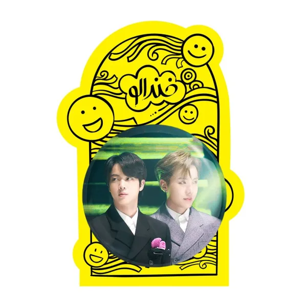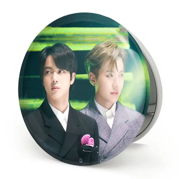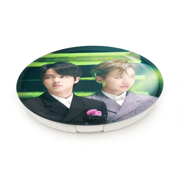آینه های تاشو گروه بی تی اس BTS خندالو، از جنس پلاستیک فشرده ABS تولید شده و به رنگ سفید می باشد. یکی از آینه ها ابعاد واقعی را نشان داده و دیگری با قابلیت بزرگنمایی، جزئیات را بهتر نمایش می دهد. ابعاد هر یک از آینه ها، دایره ای به قطر 7.5 سانت می باشد که نه خیلی بزرگ و غیر قابل استفاده در کیف آرایشی ست و نه خیلی کوچک که تصویر خاصی در آن مشاهده نشود. آینه تاشو گروه بی تی اس BTS سایزی استاندارد و کارآمد دارد و در هر کیفی جا میگیرد. چاپ طرح بوسیله چاپگرهای دیجیتال شش رنگ با شفافیت و کیفیتی مثال زدنی بر روی یک وجه از بدنه ی آینه انجام گرفته و با روکش لمینت حرارتی پوشیده شده که در مقابل آسیب و خط و خش مقاوم بوده و کیفیت بالایی دارد. درب آینه بوسیله قفل بدنه ی آن، باز نمی ماند و کاملا بسته می شود و مناسب قرار گیری در کیف لوازم آرایش و کیف های کوچک دستی نیز هست. آینه های تاشو گروه بی تی اس BTS خندالو با تنوع طرحی بسیار بالا، سلیقه هر نوع مخاطبی را تامین میکند.