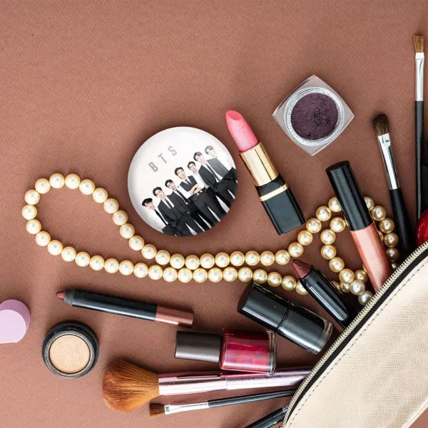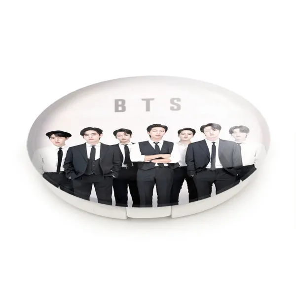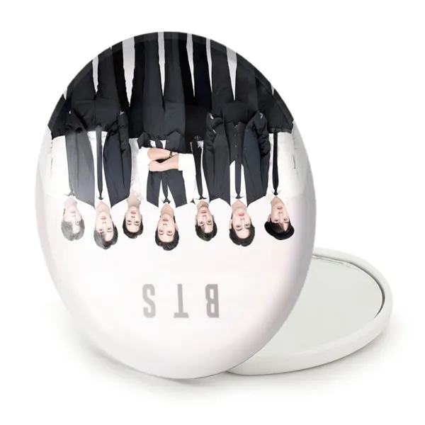 آینه های تاشو گروه بی تی اس BTS خندالو، از جنس پلاستیک فشرده ABS تولید شده و به رنگ سفید می باشد. یکی از آینه ها ابعاد واقعی را نشان داده و دیگری با قابلیت بزرگنمایی، جزئیات را بهتر نمایش می دهد. ابعاد هر یک از آینه ها، دایره ای به قطر 7.5 سانت می باشد که نه خیلی بزرگ و غیر قابل استفاده در کیف آرایشی ست و نه خیلی کوچک که تصویر خاصی در آن مشاهده نشود. آینه تاشو گروه بی تی اس BTS سایزی استاندارد و کارآمد دارد و در هر کیفی جا میگیرد. چاپ طرح بوسیله چاپگرهای دیجیتال شش رنگ با شفافیت و کیفیتی مثال زدنی بر روی یک وجه از بدنه ی آینه انجام گرفته و با روکش لمینت حرارتی پوشیده شده که در مقابل آسیب و خط و خش مقاوم بوده و کیفیت بالایی دارد. درب آینه بوسیله قفل بدنه ی آن، باز نمی ماند و کاملا بسته می شود و مناسب قرار گیری در کیف لوازم آرایش و کیف های کوچک دستی نیز هست. آینه های تاشو گروه بی تی اس BTS خندالو با تنوع طرحی بسیار بالا، سلیقه هر نوع مخاطبی را تامین میکند.
