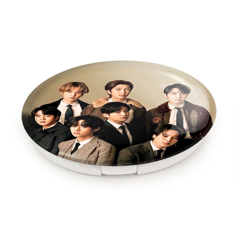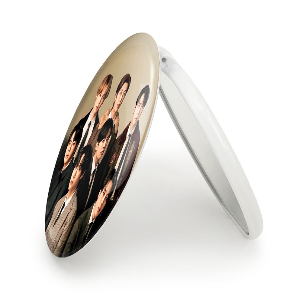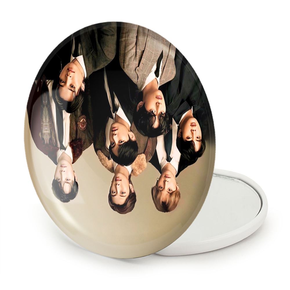 آینه های تاشو گروه بی تی اس BTS خندالو، از جنس پلاستیک فشرده ABS تولید شده و به رنگ سفید می باشد. یکی از آینه ها ابعاد واقعی را نشان داده و دیگری با قابلیت بزرگنمایی، جزئیات را بهتر نمایش می دهد. ابعاد هر یک از آینه ها، دایره ای به قطر 7.5 سانت می باشد که نه خیلی بزرگ و غیر قابل استفاده در کیف آرایشی ست و نه خیلی کوچک که تصویر خاصی در آن مشاهده نشود. آینه تاشو گروه بی تی اس BTS سایزی استاندارد و کارآمد دارد و در هر کیفی جا میگیرد. چاپ طرح بوسیله چاپگرهای دیجیتال شش رنگ با شفافیت و کیفیتی مثال زدنی بر روی یک وجه از بدنه ی آینه انجام گرفته و با روکش لمینت حرارتی پوشیده شده که در مقابل آسیب و خط و خش مقاوم بوده و کیفیت بالایی دارد. درب آینه بوسیله قفل بدنه ی آن، باز نمی ماند و کاملا بسته می شود و مناسب قرار گیری در کیف لوازم آرایش و کیف های کوچک دستی نیز هست. آینه های تاشو گروه بی تی اس BTS خندالو با تنوع طرحی بسیار بالا، سلیقه هر نوع مخاطبی را تامین میکند.