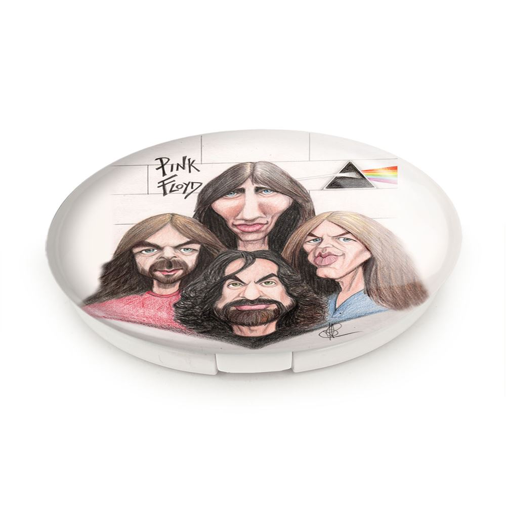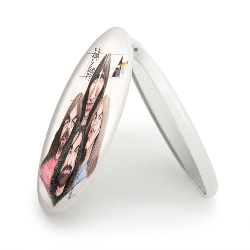 آینه های تاشو گروه پینک فلوید Pink Floyd خندالو، از جنس پلاستیک فشرده ABS تولید شده و به رنگ سفید می باشد. یکی از آینه ها ابعاد واقعی را نشان داده و دیگری با قابلیت بزرگنمایی، جزئیات را بهتر نمایش می دهد. ابعاد هر یک از آینه ها، دایره ای به قطر 7.5 سانت می باشد که نه خیلی بزرگ و غیر قابل استفاده در کیف آرایشی ست و نه خیلی کوچک که تصویر خاصی در آن مشاهده نشود. آینه تاشو گروه پینک فلوید Pink Floyd سایزی استاندارد و کارآمد دارد و در هر کیفی جا میگیرد. چاپ طرح بوسیله چاپگرهای دیجیتال شش رنگ با شفافیت و کیفیتی مثال زدنی بر روی یک وجه از بدنه ی آینه انجام گرفته و با روکش لمینت حرارتی پوشیده شده که در مقابل آسیب و خط و خش مقاوم بوده و کیفیت بالایی دارد. درب آینه بوسیله قفل بدنه ی آن، باز نمی ماند و کاملا بسته می شود و مناسب قرار گیری در کیف لوازم آرایش و کیف های کوچک دستی نیز هست. آینه های تاشو گروه پینک فلوید Pink Floyd خندالو با تنوع طرحی بسیار بالا، سلیقه هر نوع مخاطبی را تامین میکند.