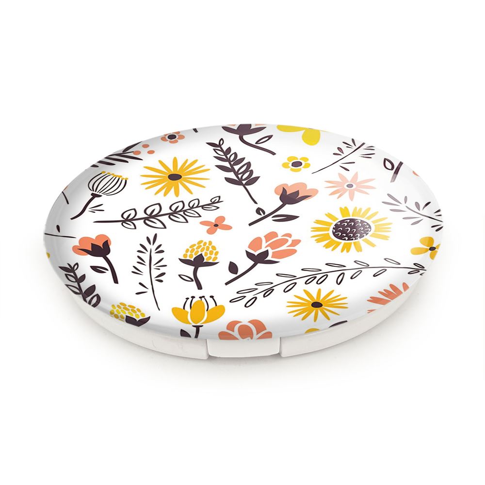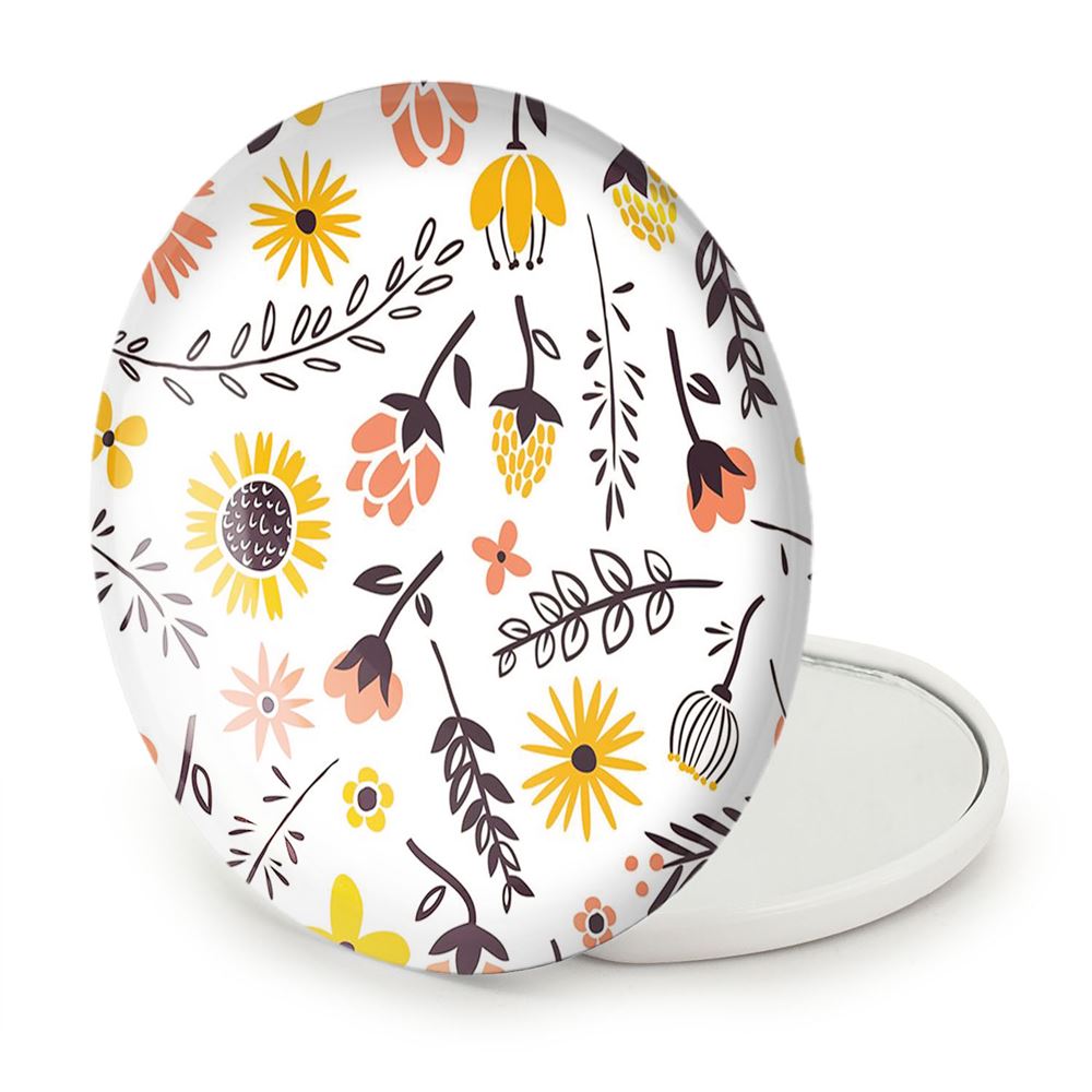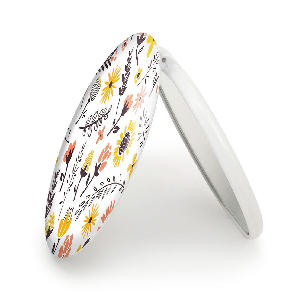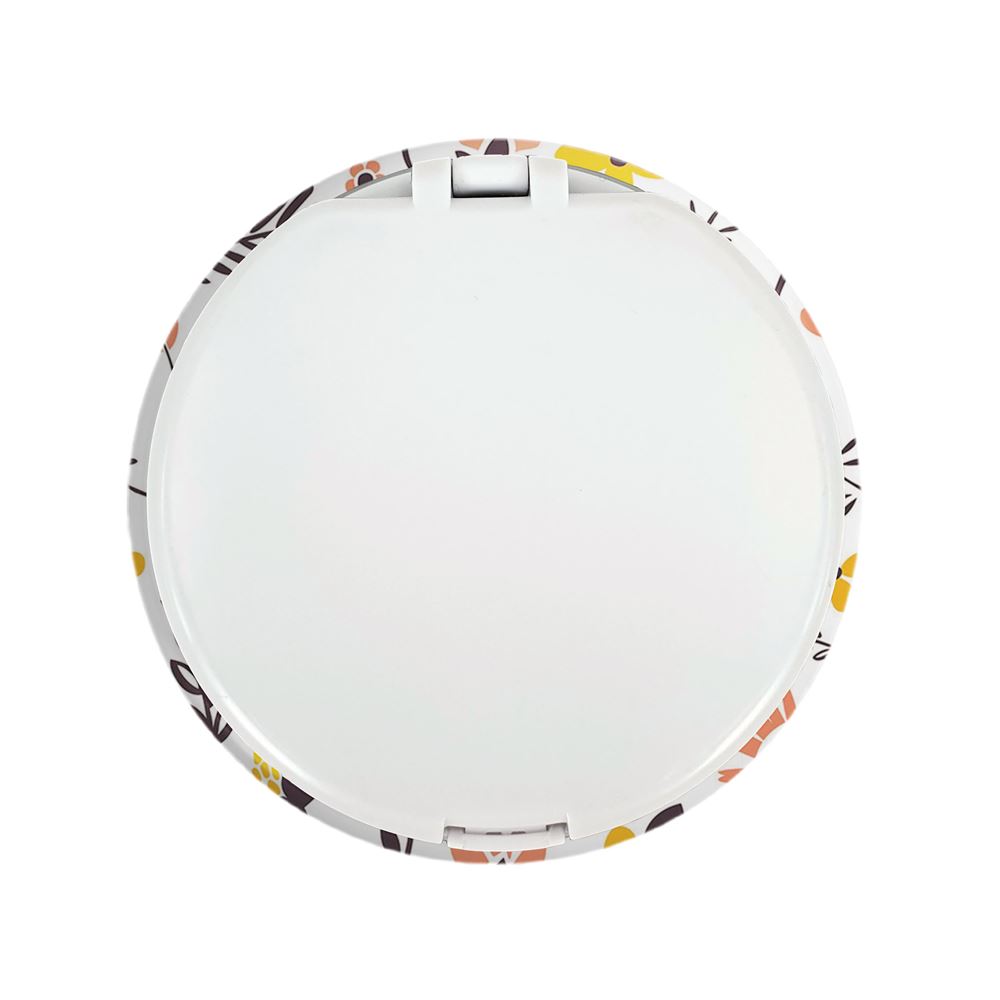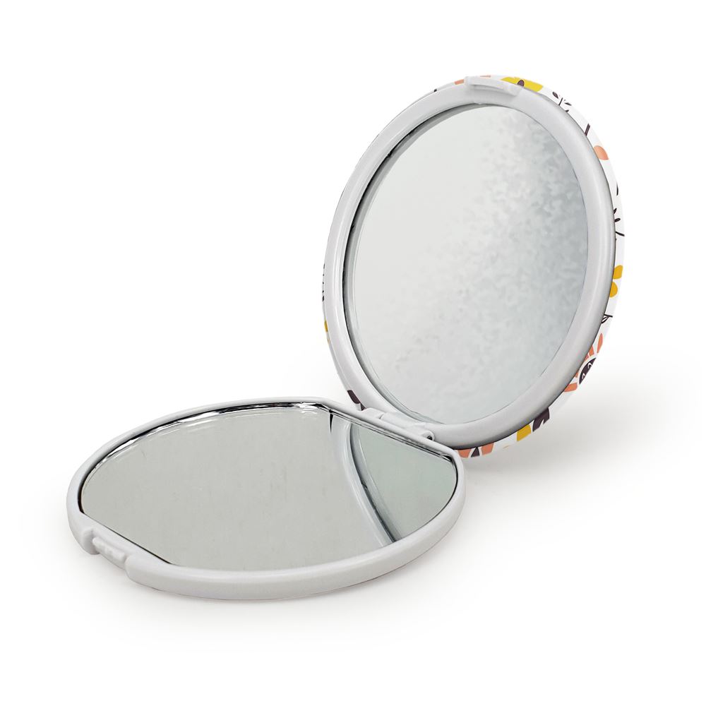 آینه های تاشو گل گلی خندالو، از جنس پلاستیک فشرده ABS تولید شده و به رنگ سفید می باشد. یکی از آینه ها ابعاد واقعی را نشان داده و دیگری با قابلیت بزرگنمایی، جزئیات را بهتر نمایش می دهد. ابعاد هر یک از آینه ها، دایره ای به قطر 7.5 سانت می باشد که نه خیلی بزرگ و غیر قابل استفاده در کیف آرایشی ست و نه خیلی کوچک که تصویر خاصی در آن مشاهده نشود. آینه تاشو گل گلی سایزی استاندارد و کارآمد دارد و در هر کیفی جا میگیرد. چاپ طرح بوسیله چاپگرهای دیجیتال شش رنگ با شفافیت و کیفیتی مثال زدنی بر روی یک وجه از بدنه ی آینه انجام گرفته و با روکش لمینت حرارتی پوشیده شده که در مقابل آسیب و خط و خش مقاوم بوده و کیفیت بالایی دارد. درب آینه بوسیله قفل بدنه ی آن، باز نمی ماند و کاملا بسته می شود و مناسب قرار گیری در کیف لوازم آرایش و کیف های کوچک دستی نیز هست. آینه های تاشو گل گلی خندالو با تنوع طرحی بسیار بالا، سلیقه هر نوع مخاطبی را تامین میکند.
