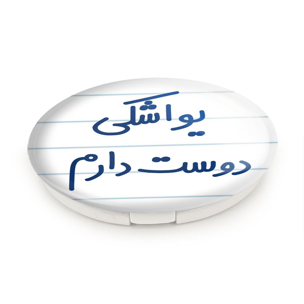 آینه های تاشو یواشکی دوست دارم خندالو، از جنس پلاستیک فشرده ABS تولید شده و به رنگ سفید می باشد. یکی از آینه ها ابعاد واقعی را نشان داده و دیگری با قابلیت بزرگنمایی، جزئیات را بهتر نمایش می دهد. ابعاد هر یک از آینه ها، دایره ای به قطر 7.5 سانت می باشد که نه خیلی بزرگ و غیر قابل استفاده در کیف آرایشی ست و نه خیلی کوچک که تصویر خاصی در آن مشاهده نشود. آینه تاشو یواشکی دوست دارم سایزی استاندارد و کارآمد دارد و در هر کیفی جا میگیرد. چاپ طرح بوسیله چاپگرهای دیجیتال شش رنگ با شفافیت و کیفیتی مثال زدنی بر روی یک وجه از بدنه ی آینه انجام گرفته و با روکش لمینت حرارتی پوشیده شده که در مقابل آسیب و خط و خش مقاوم بوده و کیفیت بالایی دارد. درب آینه بوسیله قفل بدنه ی آن، باز نمی ماند و کاملا بسته می شود و مناسب قرار گیری در کیف لوازم آرایش و کیف های کوچک دستی نیز هست. آینه های تاشو یواشکی دوست دارم خندالو با تنوع طرحی بسیار بالا، سلیقه هر نوع مخاطبی را تامین میکند.