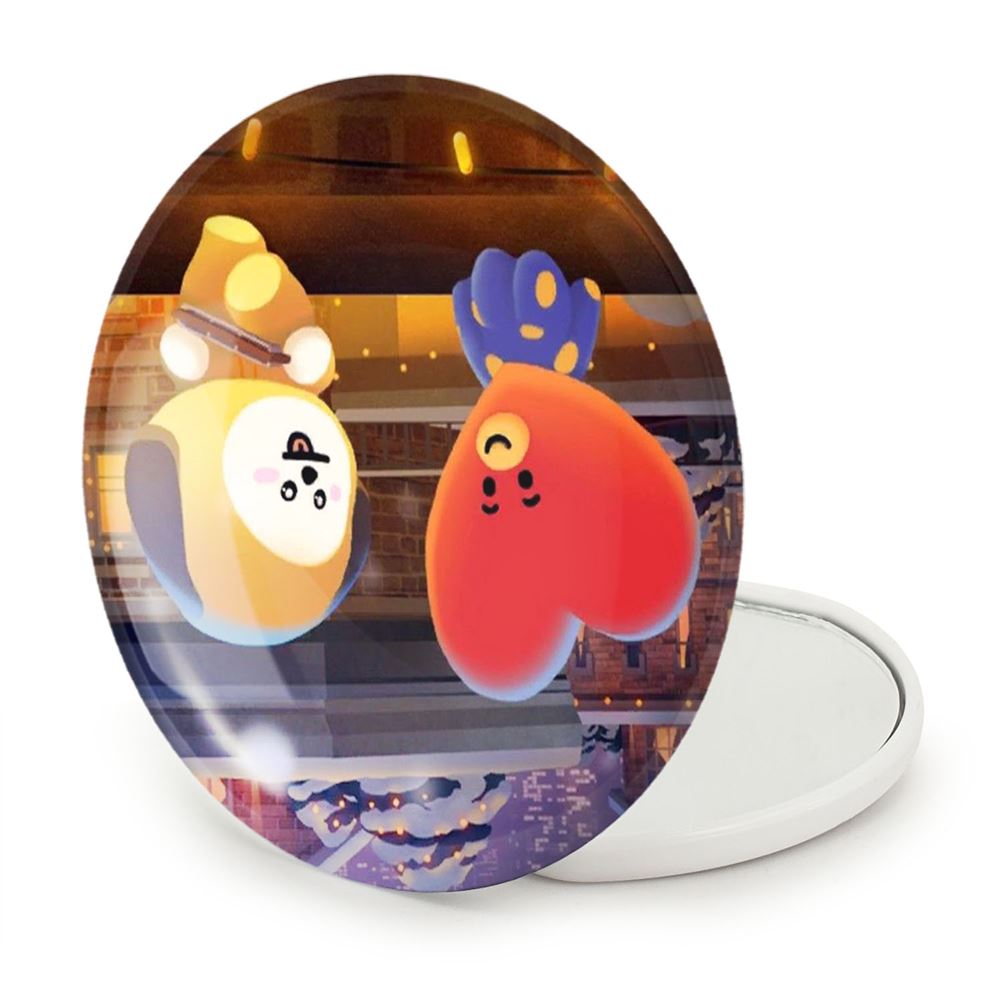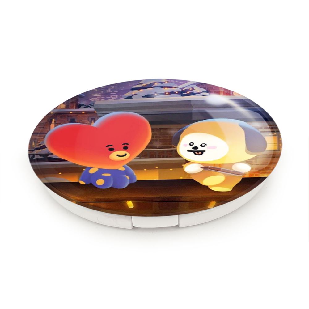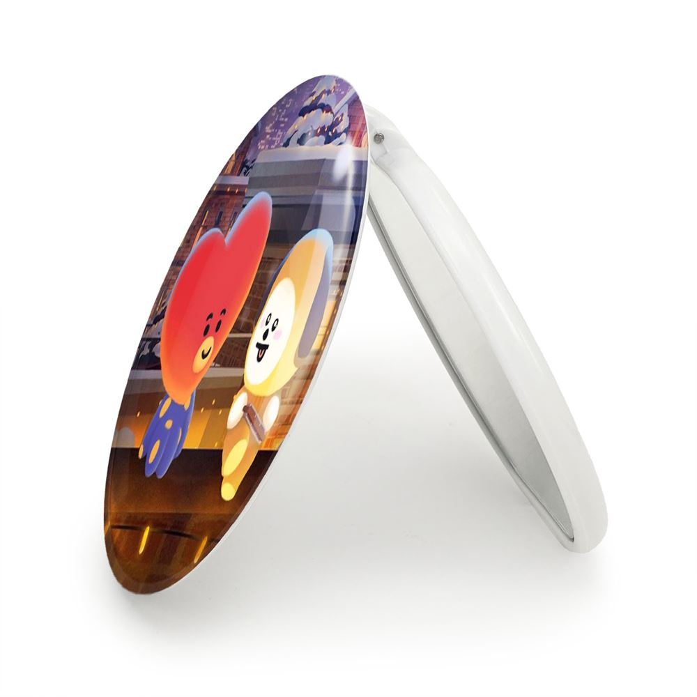 آینه های تاشو BT21 خندالو، از جنس پلاستیک فشرده ABS تولید شده و به رنگ سفید می باشد. یکی از آینه ها ابعاد واقعی را نشان داده و دیگری با قابلیت بزرگنمایی، جزئیات را بهتر نمایش می دهد. ابعاد هر یک از آینه ها، دایره ای به قطر 7.5 سانت می باشد که نه خیلی بزرگ و غیر قابل استفاده در کیف آرایشی ست و نه خیلی کوچک که تصویر خاصی در آن مشاهده نشود. آینه تاشو BT21 سایزی استاندارد و کارآمد دارد و در هر کیفی جا میگیرد. چاپ طرح بوسیله چاپگرهای دیجیتال شش رنگ با شفافیت و کیفیتی مثال زدنی بر روی یک وجه از بدنه ی آینه انجام گرفته و با روکش لمینت حرارتی پوشیده شده که در مقابل آسیب و خط و خش مقاوم بوده و کیفیت بالایی دارد. درب آینه بوسیله قفل بدنه ی آن، باز نمی ماند و کاملا بسته می شود و مناسب قرار گیری در کیف لوازم آرایش و کیف های کوچک دستی نیز هست. آینه های تاشو BT21 خندالو با تنوع طرحی بسیار بالا، سلیقه هر نوع مخاطبی را تامین میکند.