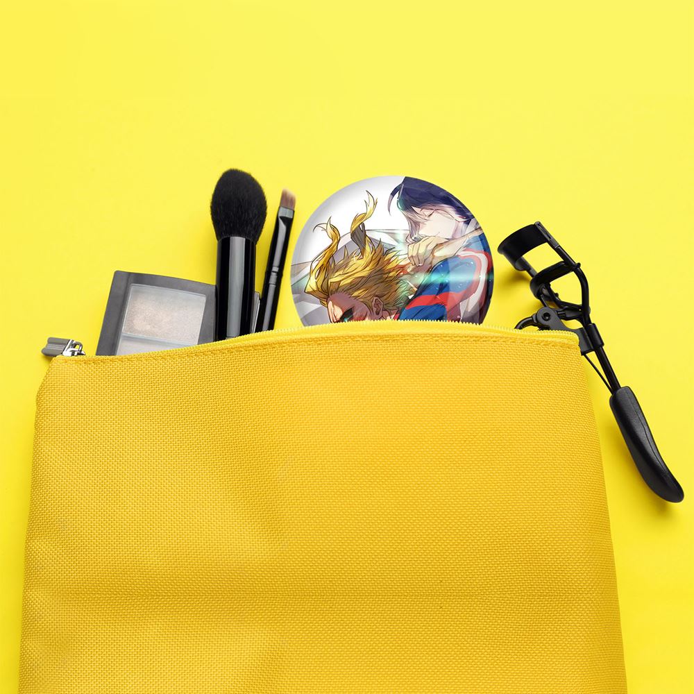 آینه های جیبی آلمایت انیمه آکادمی قهرمان من خندالو دایره ای به قطر 7.5 سانتی متر می باشد که نه خیلی بزرگ و غیر قابل استفاده در کیف آرایشی ست و نه خیلی کوچک که تصویر خاصی در آن مشاهده نشود. سایزی استاندارد و کارآمد دارد و مناسب قرار گیری در کیف لوازم آرایش و کیف های کوچک دستی نیز هست. بدنه ی آینه جیبی آلمایت انیمه آکادمی قهرمان من در قسمتی که آینه را در بر گرفته فلزی بوده و ظاهر براق و بسیار زیبایی دارد. چاپ طرح در پشت آینه بوسیله چاپگرهای دیجیتال شش رنگ با شفافیت و کیفیتی مثال زدنی انجام گرفته و با روکش لمینت حرارتی پوشیده شده که در مقابل آسیب و خط و خش مقاوم بوده و کیفیت بالایی دارد. آینه های جیبی آلمایت انیمه آکادمی قهرمان من خندالو با تنوع طرحی بسیار بالا، سلیقه هر نوع مخاطبی را تامین میکند.