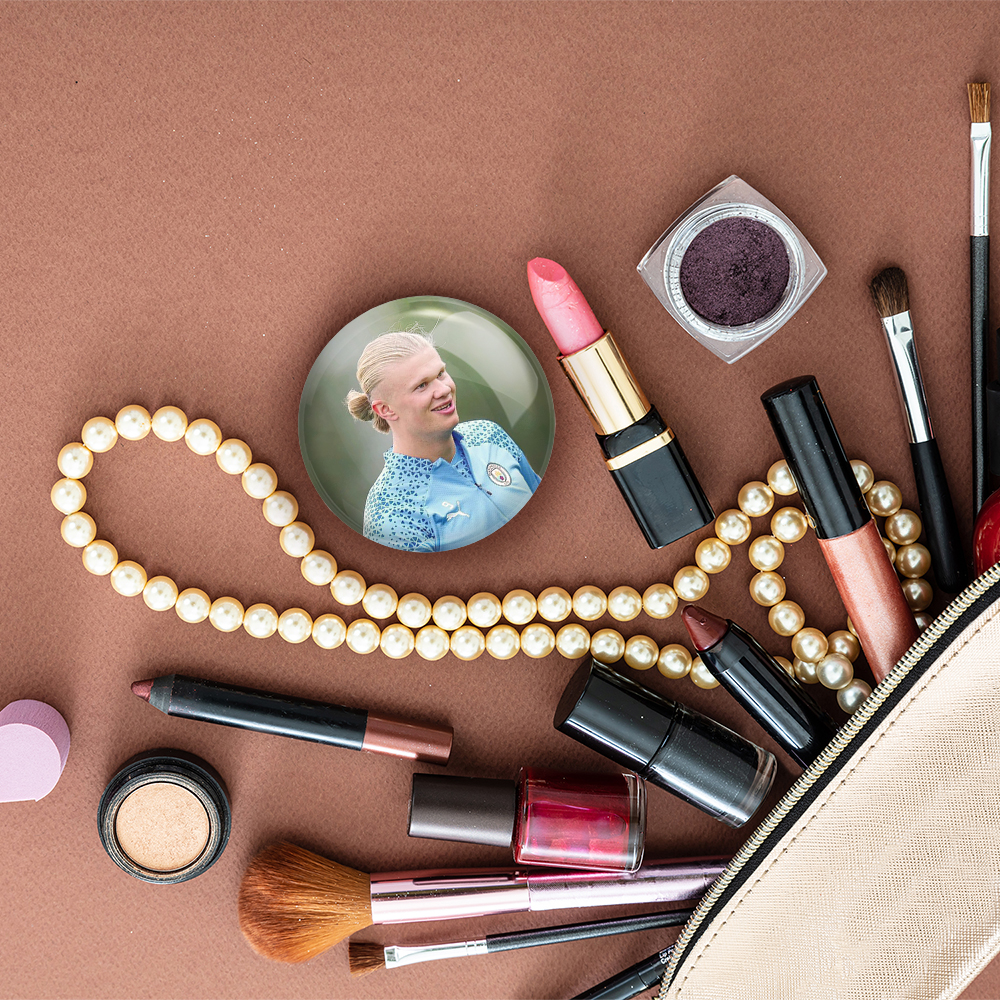آینه های جیبی ارلینگ هالند (Erling Haaland) خندالو دایره ای به قطر 7.5 سانتی متر می باشد که نه خیلی بزرگ و غیر قابل استفاده در کیف آرایشی ست و نه خیلی کوچک که تصویر خاصی در آن مشاهده نشود. سایزی استاندارد و کارآمد دارد و مناسب قرار گیری در کیف لوازم آرایش و کیف های کوچک دستی نیز هست.