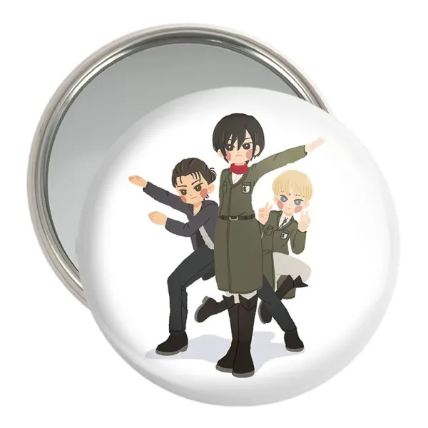 آینه های جیبی ارمین میکاسا ارن انیمه اتک آن تایتان Attack on Titan خندالو دایره ای به قطر 7.5 سانتی متر می باشد که نه خیلی بزرگ و غیر قابل استفاده در کیف آرایشی ست و نه خیلی کوچک که تصویر خاصی در آن مشاهده نشود. سایزی استاندارد و کارآمد دارد و مناسب قرار گیری در کیف لوازم آرایش و کیف های کوچک دستی نیز هست. بدنه ی آینه جیبی ارمین میکاسا ارن انیمه اتک آن تایتان Attack on Titan در قسمتی که آینه را در بر گرفته فلزی بوده و ظاهر براق و بسیار زیبایی دارد. چاپ طرح در پشت آینه بوسیله چاپگرهای دیجیتال شش رنگ با شفافیت و کیفیتی مثال زدنی انجام گرفته و با روکش لمینت حرارتی پوشیده شده که در مقابل آسیب و خط و خش مقاوم بوده و کیفیت بالایی دارد. آینه های جیبی ارمین میکاسا ارن انیمه اتک آن تایتان Attack on Titan خندالو با تنوع طرحی بسیار بالا، سلیقه هر نوع مخاطبی را تامین میکند.