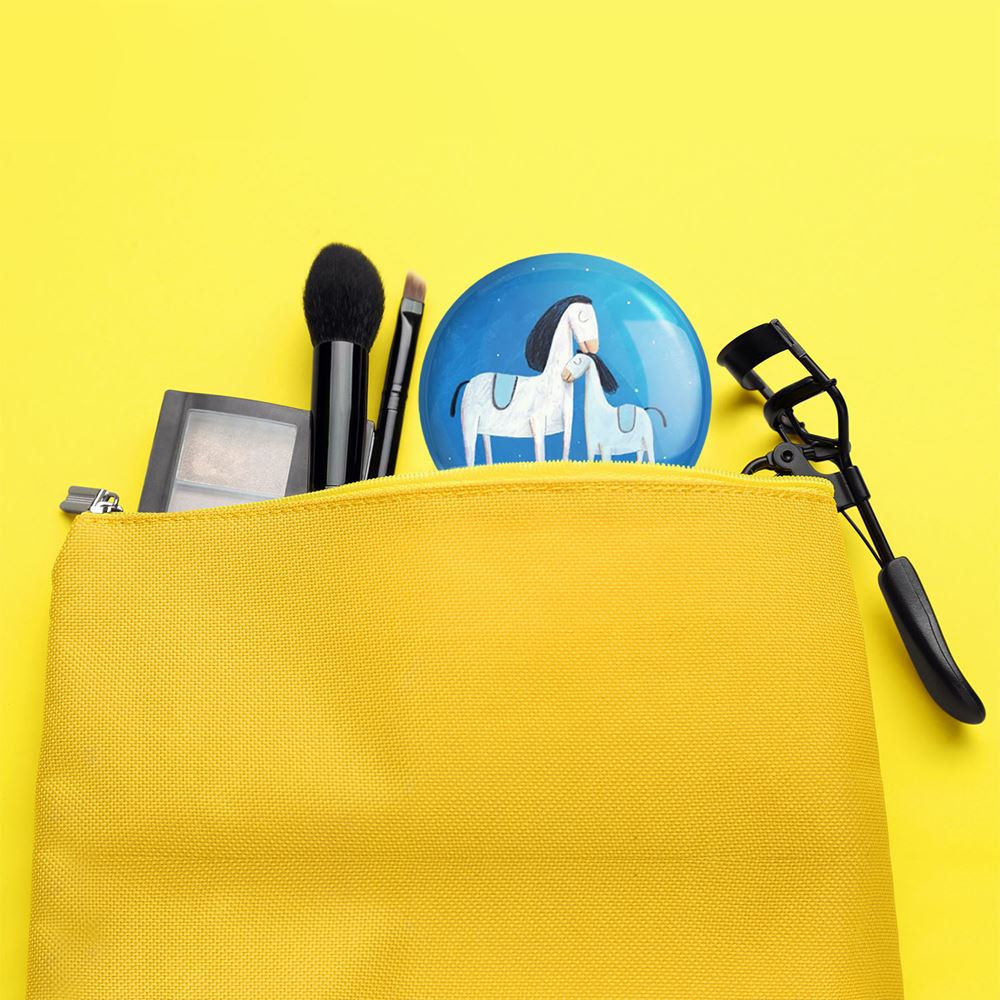 آینه های جیبی اسب خندالو دایره ای به قطر 7.5 سانتی متر می باشد که نه خیلی بزرگ و غیر قابل استفاده در کیف آرایشی ست و نه خیلی کوچک که تصویر خاصی در آن مشاهده نشود. سایزی استاندارد و کارآمد دارد و مناسب قرار گیری در کیف لوازم آرایش و کیف های کوچک دستی نیز هست. بدنه ی آینه جیبی اسب در قسمتی که آینه را در بر گرفته فلزی بوده و ظاهر براق و بسیار زیبایی دارد. چاپ طرح در پشت آینه بوسیله چاپگرهای دیجیتال شش رنگ با شفافیت و کیفیتی مثال زدنی انجام گرفته و با روکش لمینت حرارتی پوشیده شده که در مقابل آسیب و خط و خش مقاوم بوده و کیفیت بالایی دارد. آینه های جیبی اسب خندالو با تنوع طرحی بسیار بالا، سلیقه هر نوع مخاطبی را تامین میکند.