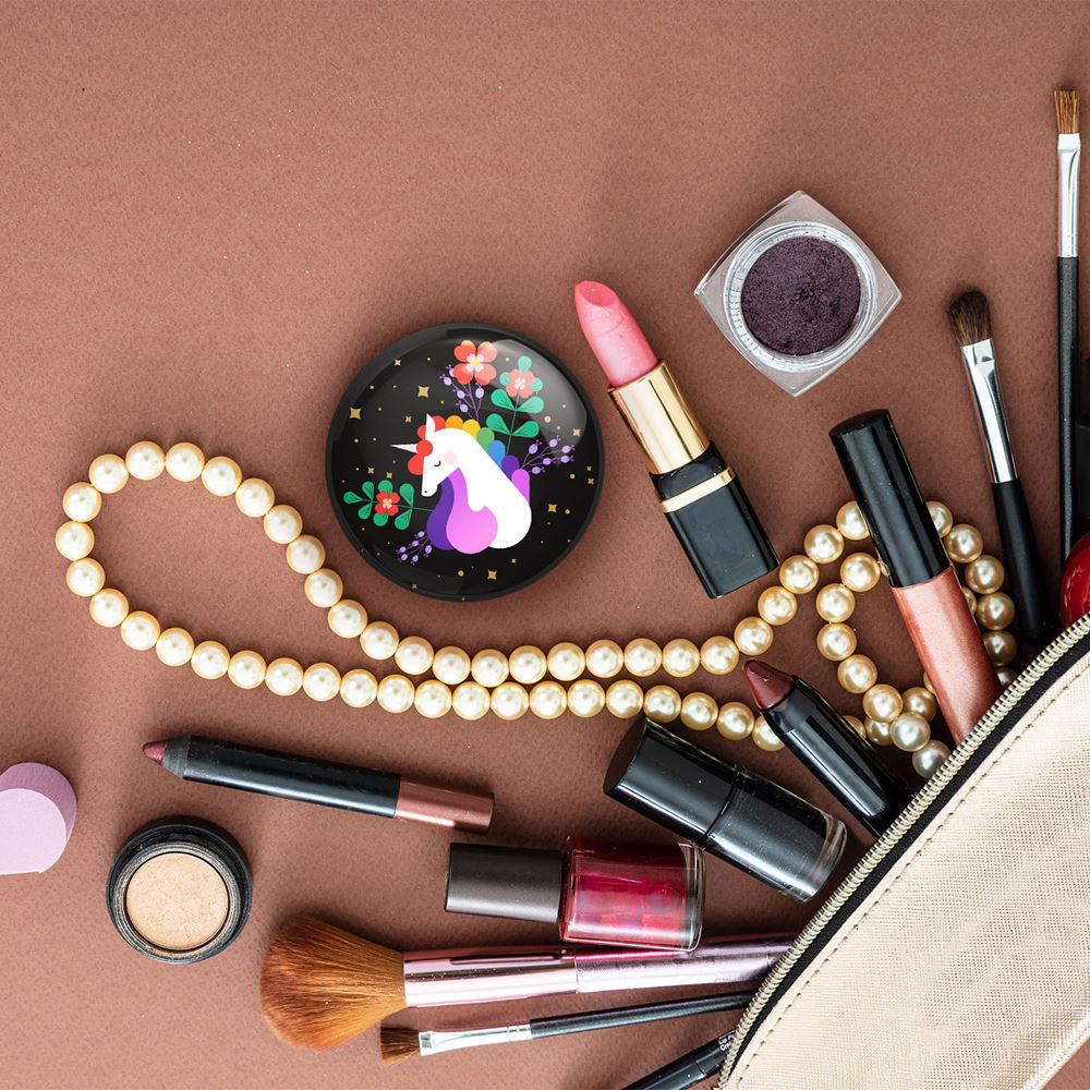 آینه های جیبی اسب تک شاخ یونیکورن خندالو دایره ای به قطر 7.5 سانتی متر می باشد که نه خیلی بزرگ و غیر قابل استفاده در کیف آرایشی ست و نه خیلی کوچک که تصویر خاصی در آن مشاهده نشود. سایزی استاندارد و کارآمد دارد و مناسب قرار گیری در کیف لوازم آرایش و کیف های کوچک دستی نیز هست.