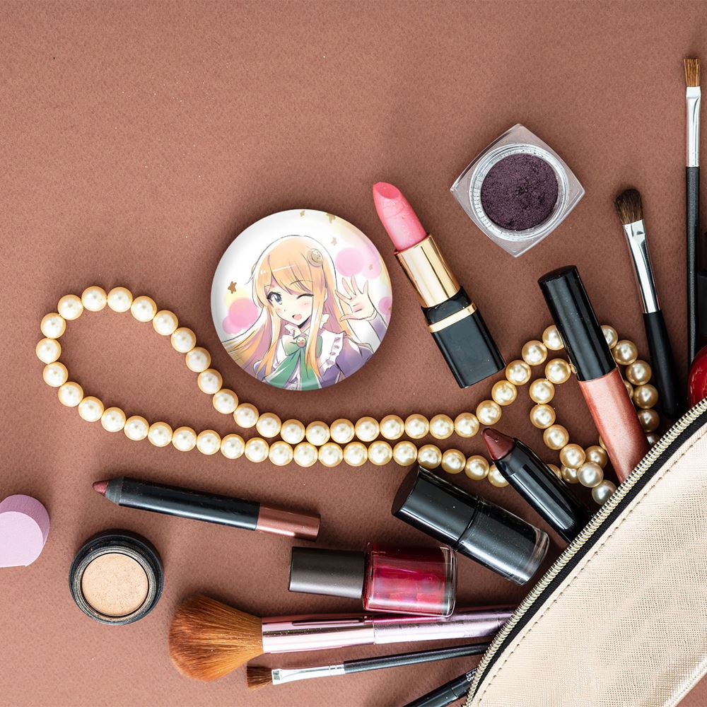 آینه های جیبی انیمه در دنیایی دیگر با تلفن هوشمندم خندالو دایره ای به قطر 7.5 سانتی متر می باشد که نه خیلی بزرگ و غیر قابل استفاده در کیف آرایشی ست و نه خیلی کوچک که تصویر خاصی در آن مشاهده نشود. سایزی استاندارد و کارآمد دارد و مناسب قرار گیری در کیف لوازم آرایش و کیف های کوچک دستی نیز هست.