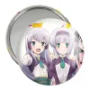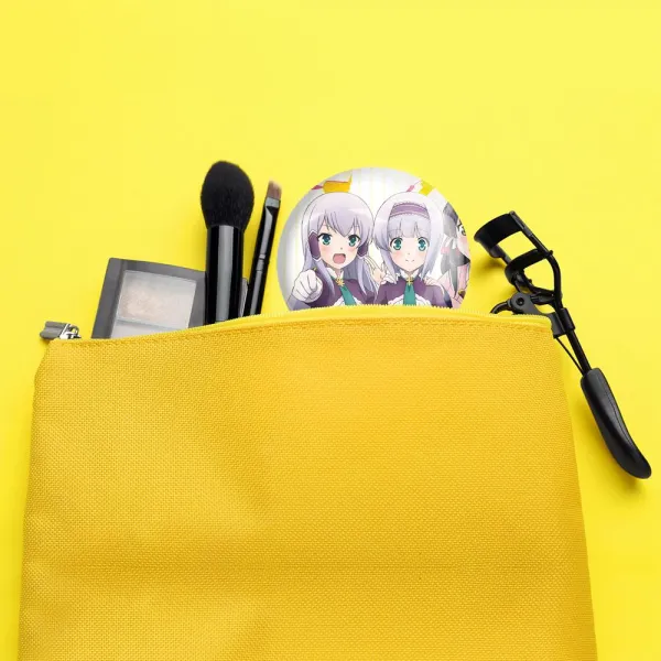 آینه های جیبی انیمه در دنیایی دیگر با تلفن هوشمندم خندالو دایره ای به قطر 7.5 سانتی متر می باشد که نه خیلی بزرگ و غیر قابل استفاده در کیف آرایشی ست و نه خیلی کوچک که تصویر خاصی در آن مشاهده نشود. سایزی استاندارد و کارآمد دارد و مناسب قرار گیری در کیف لوازم آرایش و کیف های کوچک دستی نیز هست.