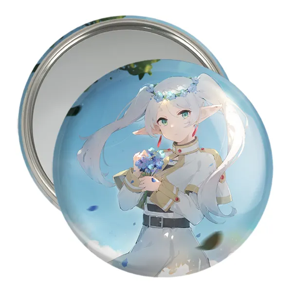 آینه های جیبی انیمه فریرن (Frieren) خندالو دایره ای به قطر 7.5 سانتی متر می باشد که نه خیلی بزرگ و غیر قابل استفاده در کیف آرایشی ست و نه خیلی کوچک که تصویر خاصی در آن مشاهده نشود. سایزی استاندارد و کارآمد دارد و مناسب قرار گیری در کیف لوازم آرایش و کیف های کوچک دستی نیز هست.
