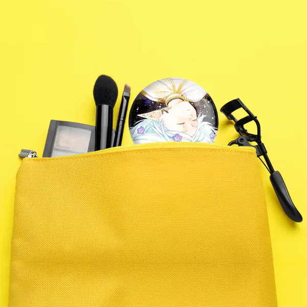 آینه های جیبی انیمه فریرن (Frieren) خندالو دایره ای به قطر 7.5 سانتی متر می باشد که نه خیلی بزرگ و غیر قابل استفاده در کیف آرایشی ست و نه خیلی کوچک که تصویر خاصی در آن مشاهده نشود. سایزی استاندارد و کارآمد دارد و مناسب قرار گیری در کیف لوازم آرایش و کیف های کوچک دستی نیز هست.