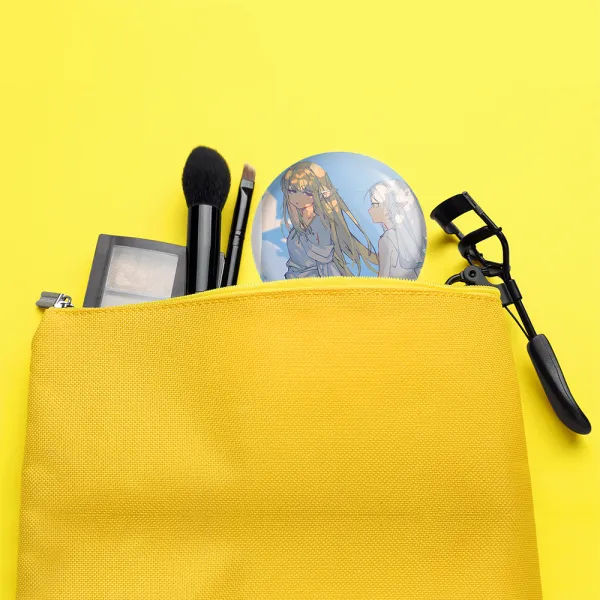 آینه های جیبی انیمه فریرن (Frieren) خندالو دایره ای به قطر 7.5 سانتی متر می باشد که نه خیلی بزرگ و غیر قابل استفاده در کیف آرایشی ست و نه خیلی کوچک که تصویر خاصی در آن مشاهده نشود. سایزی استاندارد و کارآمد دارد و مناسب قرار گیری در کیف لوازم آرایش و کیف های کوچک دستی نیز هست.