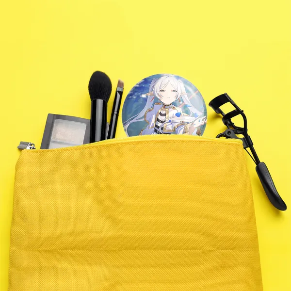 آینه های جیبی انیمه فریرن (Frieren) خندالو دایره ای به قطر 7.5 سانتی متر می باشد که نه خیلی بزرگ و غیر قابل استفاده در کیف آرایشی ست و نه خیلی کوچک که تصویر خاصی در آن مشاهده نشود. سایزی استاندارد و کارآمد دارد و مناسب قرار گیری در کیف لوازم آرایش و کیف های کوچک دستی نیز هست.