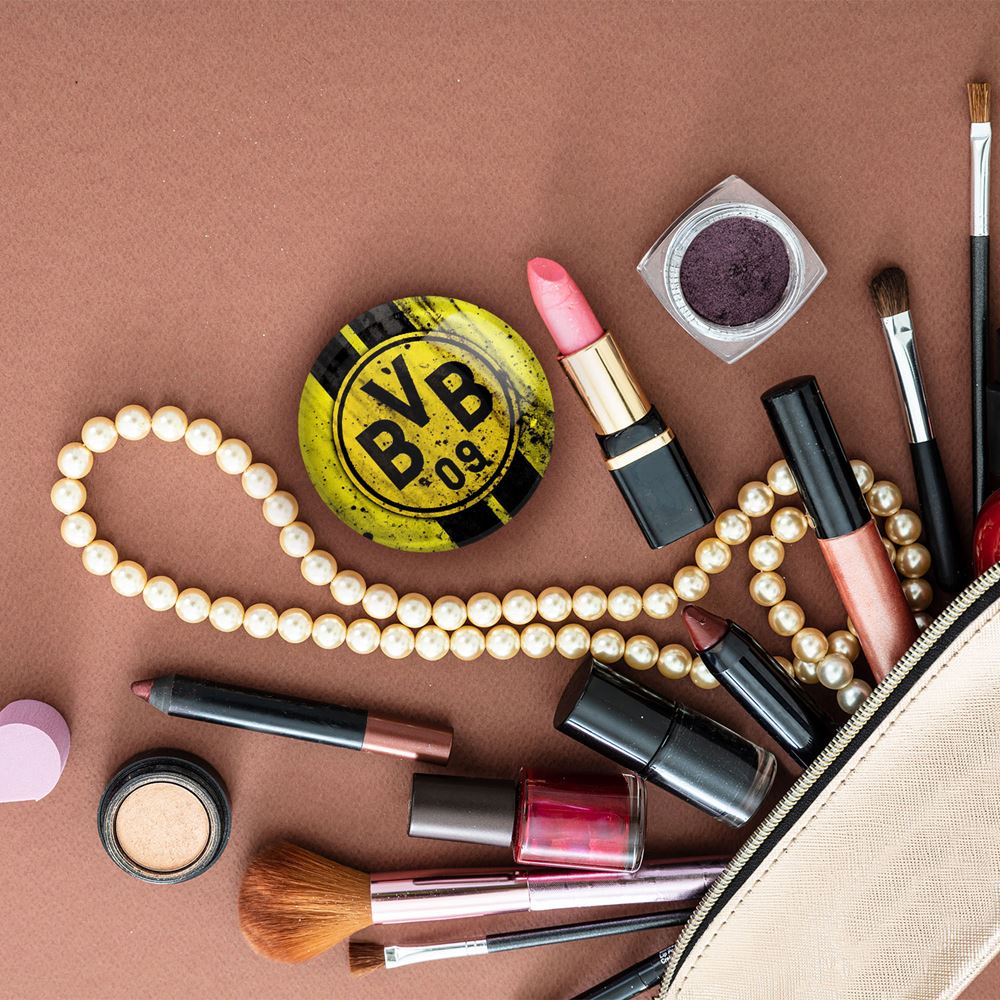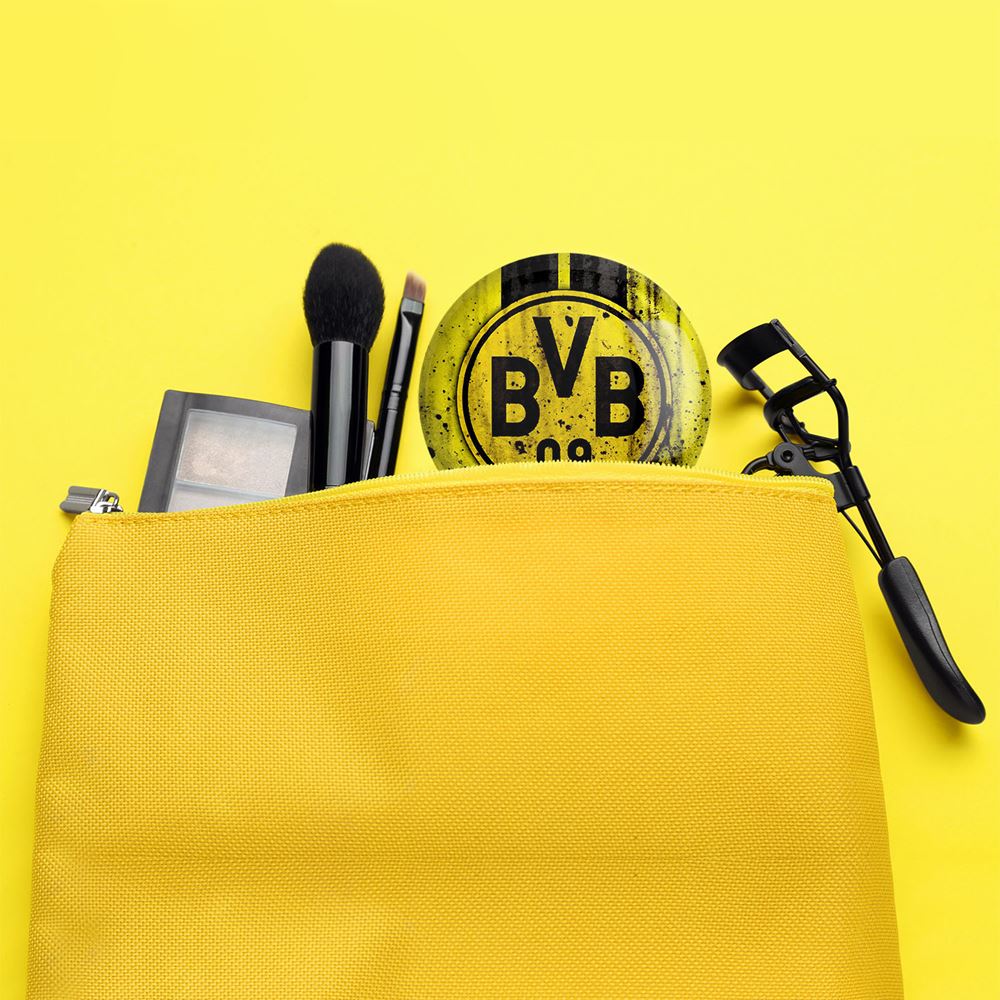 آینه های جیبی باشگاه دورتموند خندالو دایره ای به قطر 7.5 سانتی متر می باشد که نه خیلی بزرگ و غیر قابل استفاده در کیف آرایشی ست و نه خیلی کوچک که تصویر خاصی در آن مشاهده نشود. سایزی استاندارد و کارآمد دارد و مناسب قرار گیری در کیف لوازم آرایش و کیف های کوچک دستی نیز هست. بدنه ی آینه جیبی باشگاه دورتموند در قسمتی که آینه را در بر گرفته فلزی بوده و ظاهر براق و بسیار زیبایی دارد. چاپ طرح در پشت آینه بوسیله چاپگرهای دیجیتال شش رنگ با شفافیت و کیفیتی مثال زدنی انجام گرفته و با روکش لمینت حرارتی پوشیده شده که در مقابل آسیب و خط و خش مقاوم بوده و کیفیت بالایی دارد. آینه های جیبی باشگاه دورتموند خندالو با تنوع طرحی بسیار بالا، سلیقه هر نوع مخاطبی را تامین میکند.