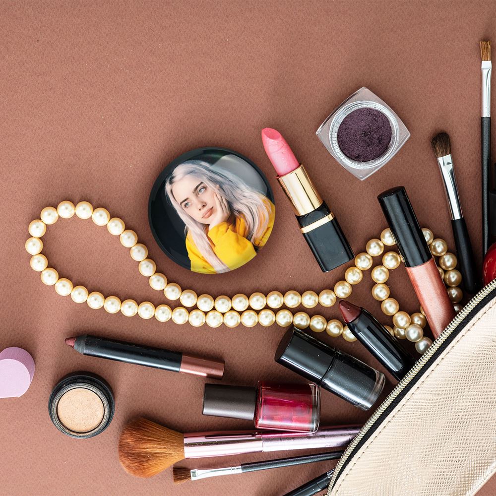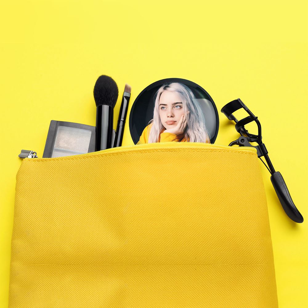 آینه های جیبی بیلی آیلیش Billie Eilish خندالو دایره ای به قطر 7.5 سانتی متر می باشد که نه خیلی بزرگ و غیر قابل استفاده در کیف آرایشی ست و نه خیلی کوچک که تصویر خاصی در آن مشاهده نشود. سایزی استاندارد و کارآمد دارد و مناسب قرار گیری در کیف لوازم آرایش و کیف های کوچک دستی نیز هست.