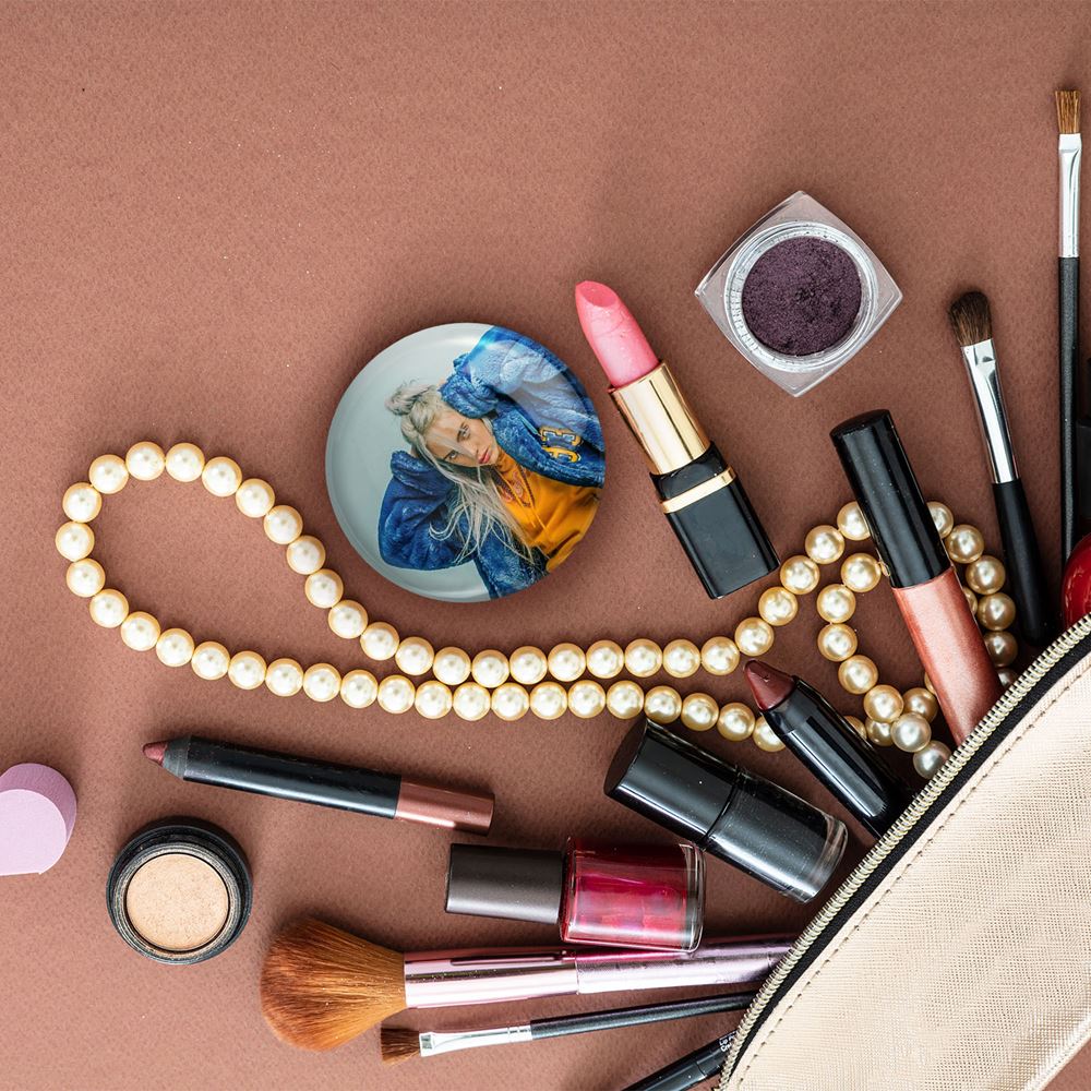 آینه های جیبی بیلی آیلیش Billie Eilish خندالو دایره ای به قطر 7.5 سانتی متر می باشد که نه خیلی بزرگ و غیر قابل استفاده در کیف آرایشی ست و نه خیلی کوچک که تصویر خاصی در آن مشاهده نشود. سایزی استاندارد و کارآمد دارد و مناسب قرار گیری در کیف لوازم آرایش و کیف های کوچک دستی نیز هست.