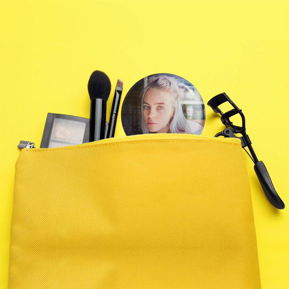 آینه های جیبی بیلی آیلیش Billie Eilish خندالو دایره ای به قطر 7.5 سانتی متر می باشد که نه خیلی بزرگ و غیر قابل استفاده در کیف آرایشی ست و نه خیلی کوچک که تصویر خاصی در آن مشاهده نشود. سایزی استاندارد و کارآمد دارد و مناسب قرار گیری در کیف لوازم آرایش و کیف های کوچک دستی نیز هست.
